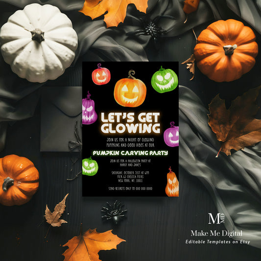 Glowing Pumpkin Carving Party Neon Halloween Invitation Template