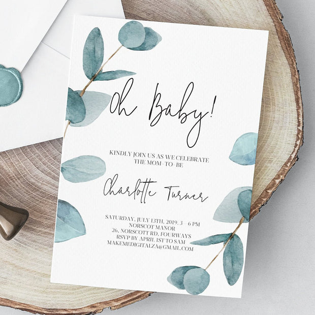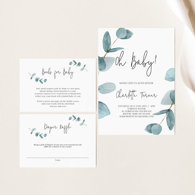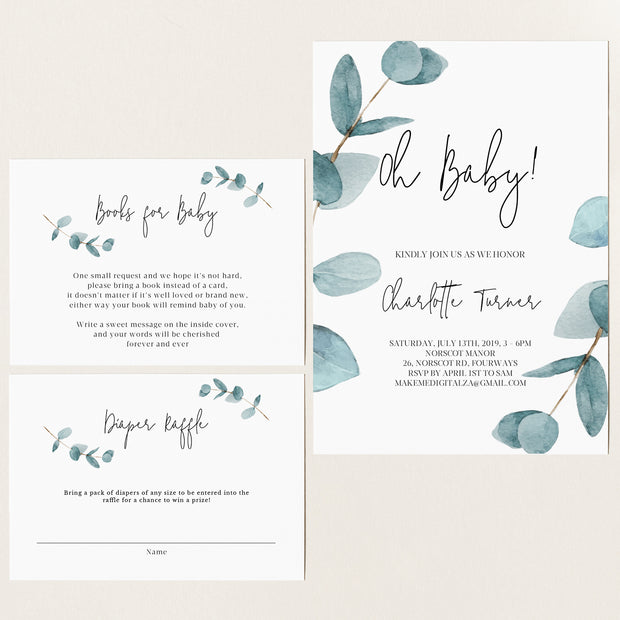 Nala Blue Eucalyptus Baby Shower Invitation set of 3