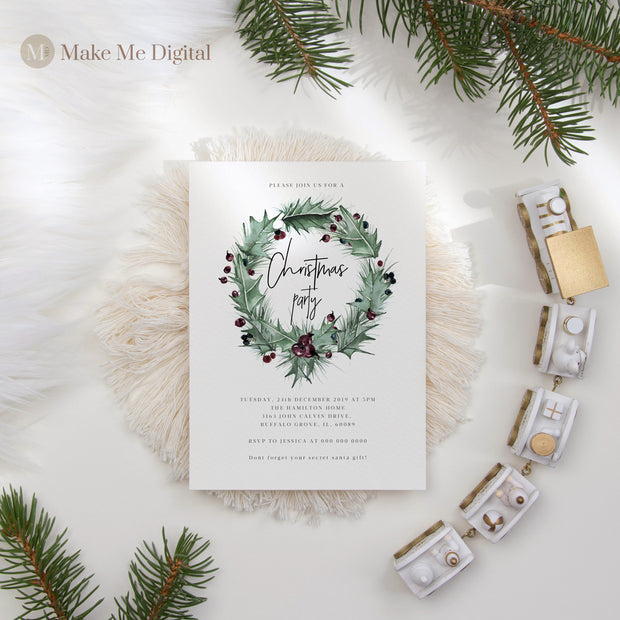 Green & Gold Christmas Pine Wedding Invitation Set of 3