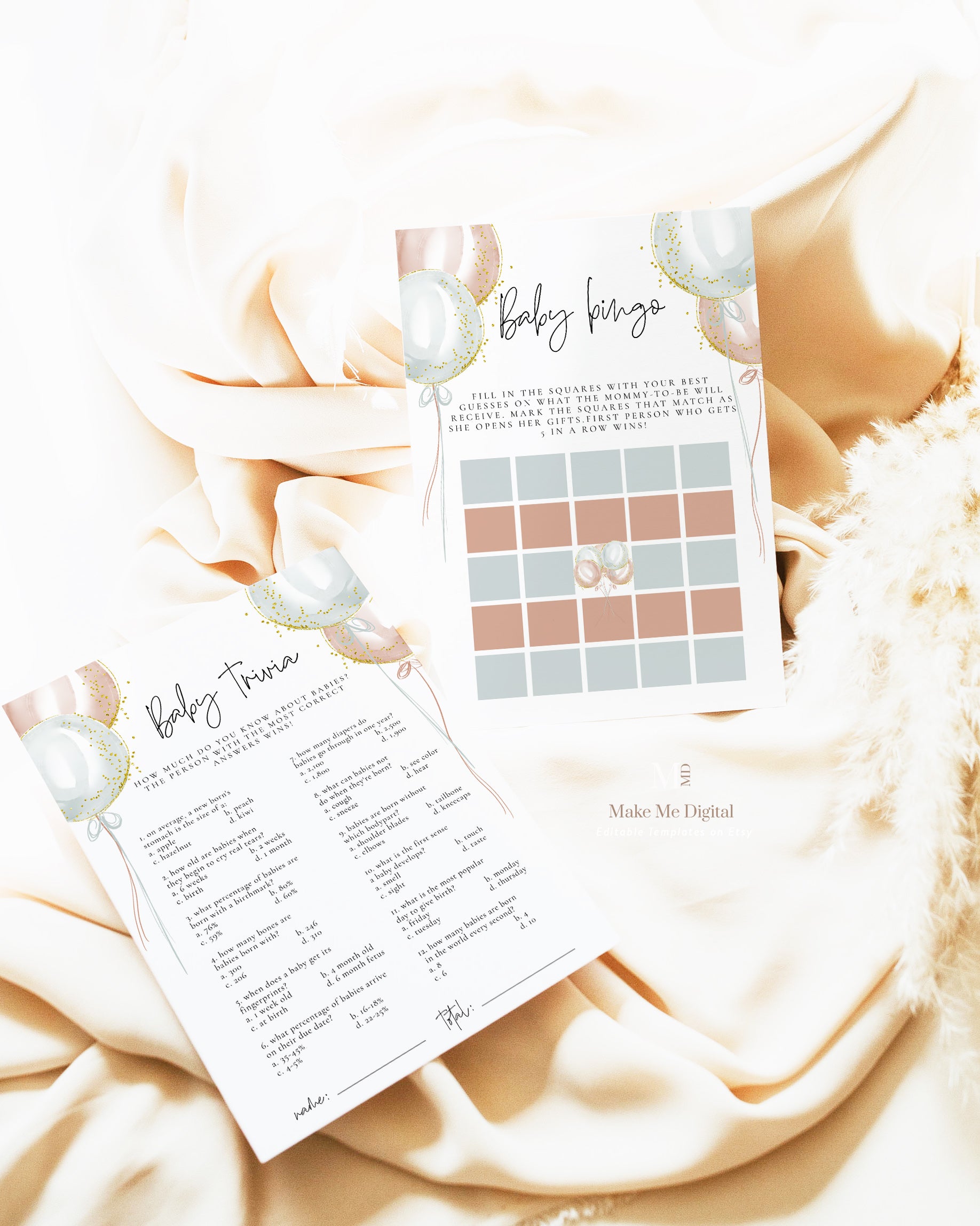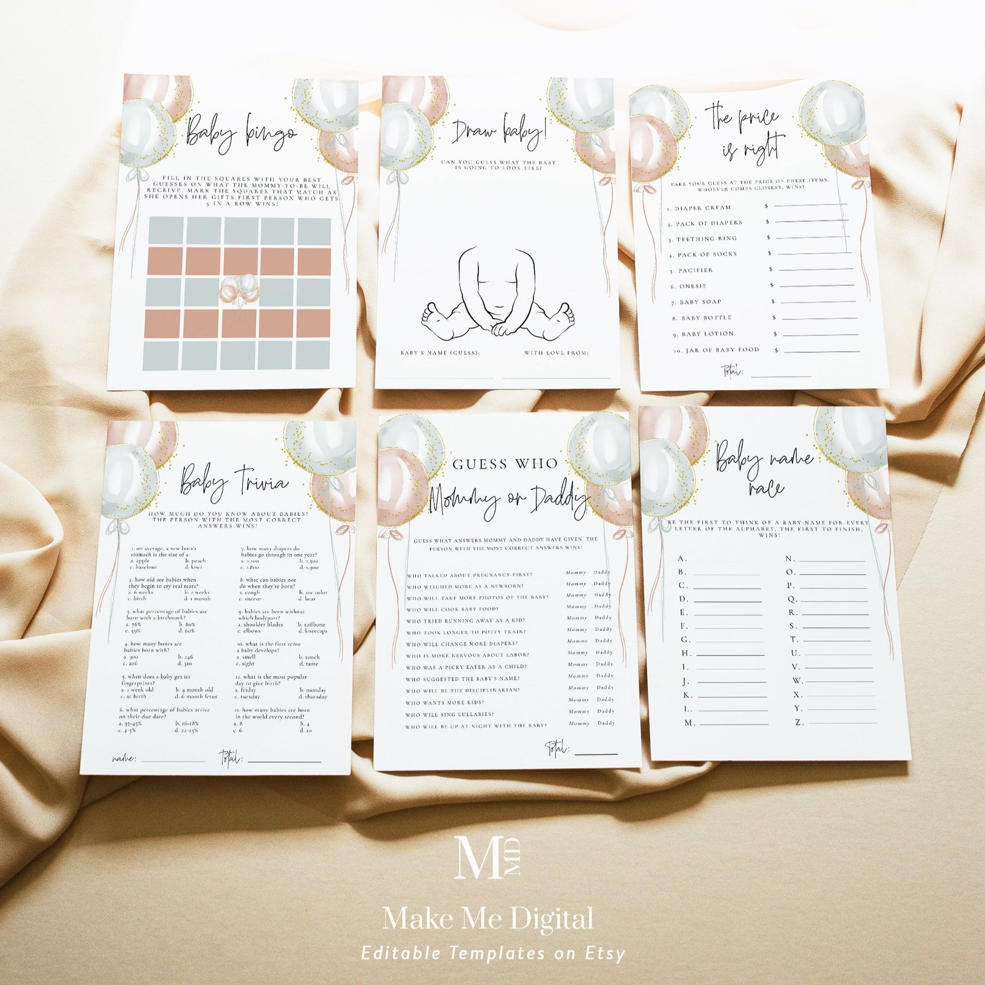 Save time, money, and wow your guests by printing your own gender reveal game bundle! Edit all the wording, colors, fonts, and icons to match your event needs