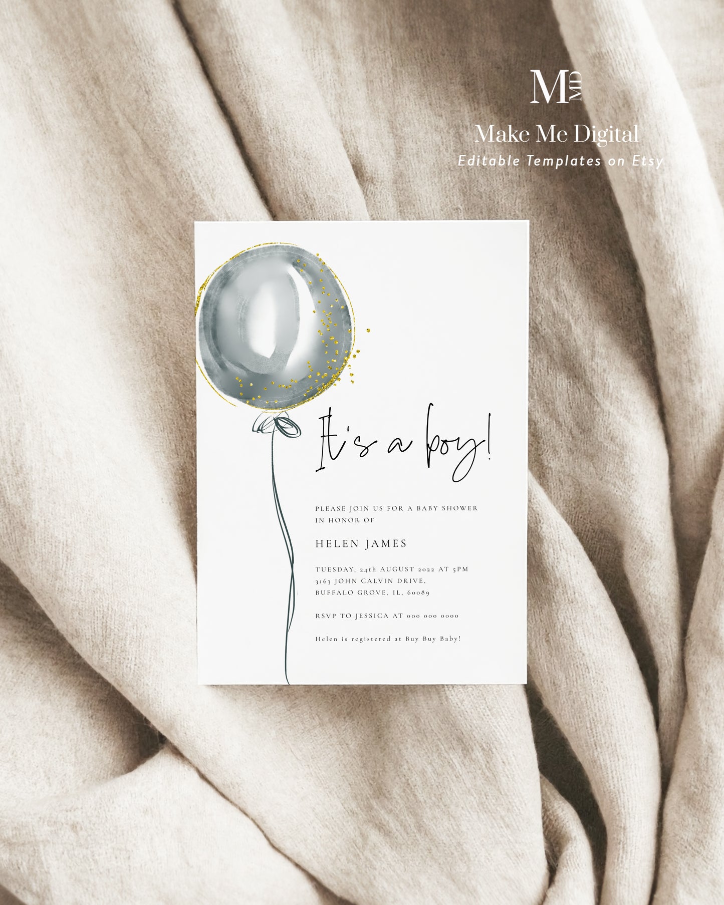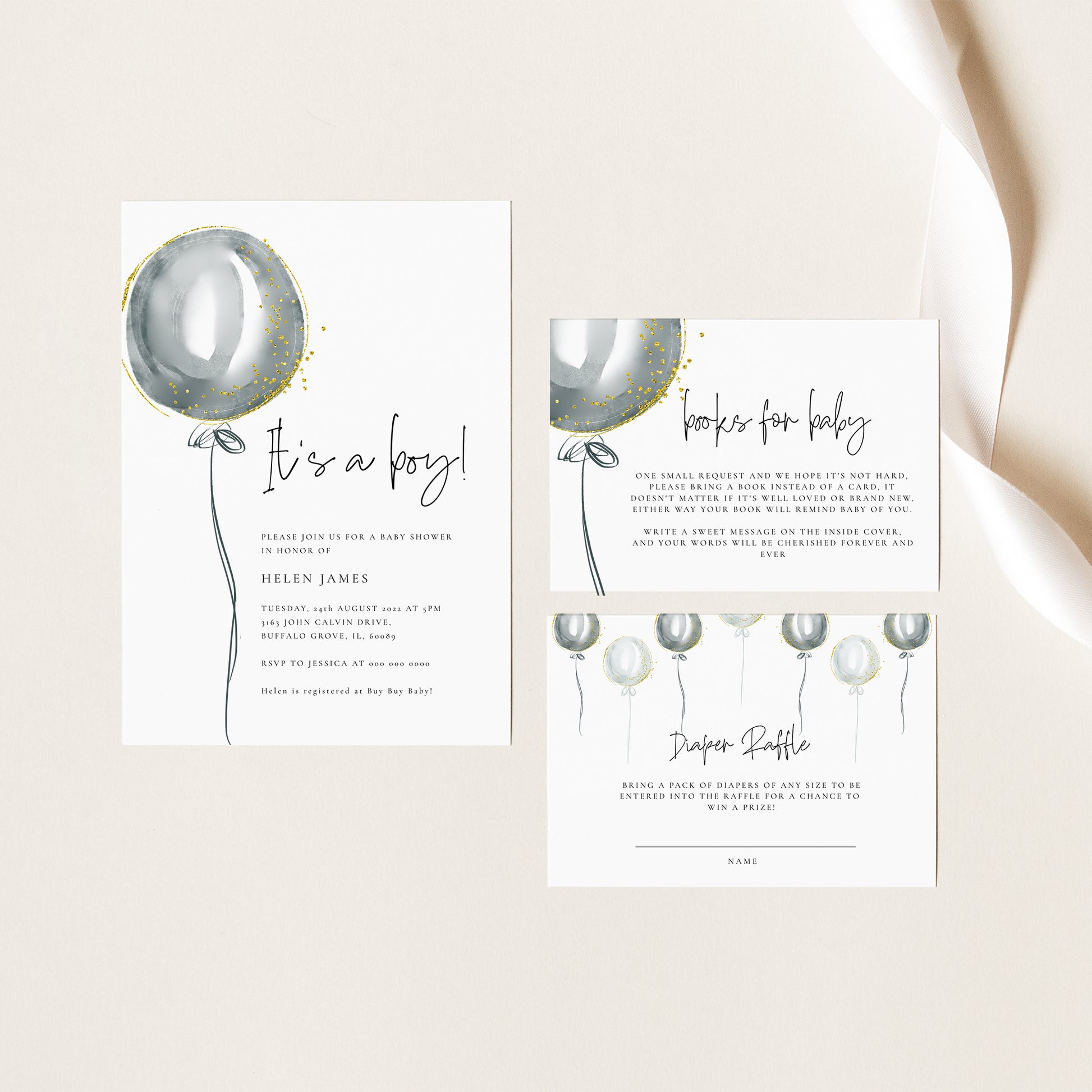 Blue Balloon Boy Baby Shower Invitation Set of 3