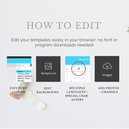 These templates can be accessed through TEMPLETT.COM; an online editor that allows you to personalize your templates without installing any software or fonts. You will receive an email from TEMPLETT.COM just moments after purchase to begin personalizing your templates. Edit, download, and print at home or with any printing center.