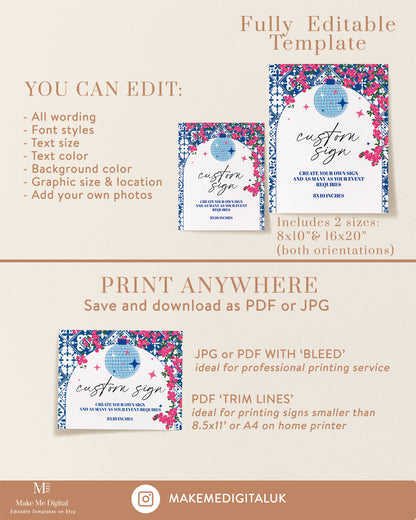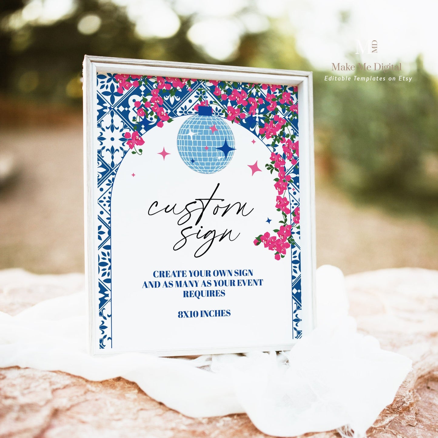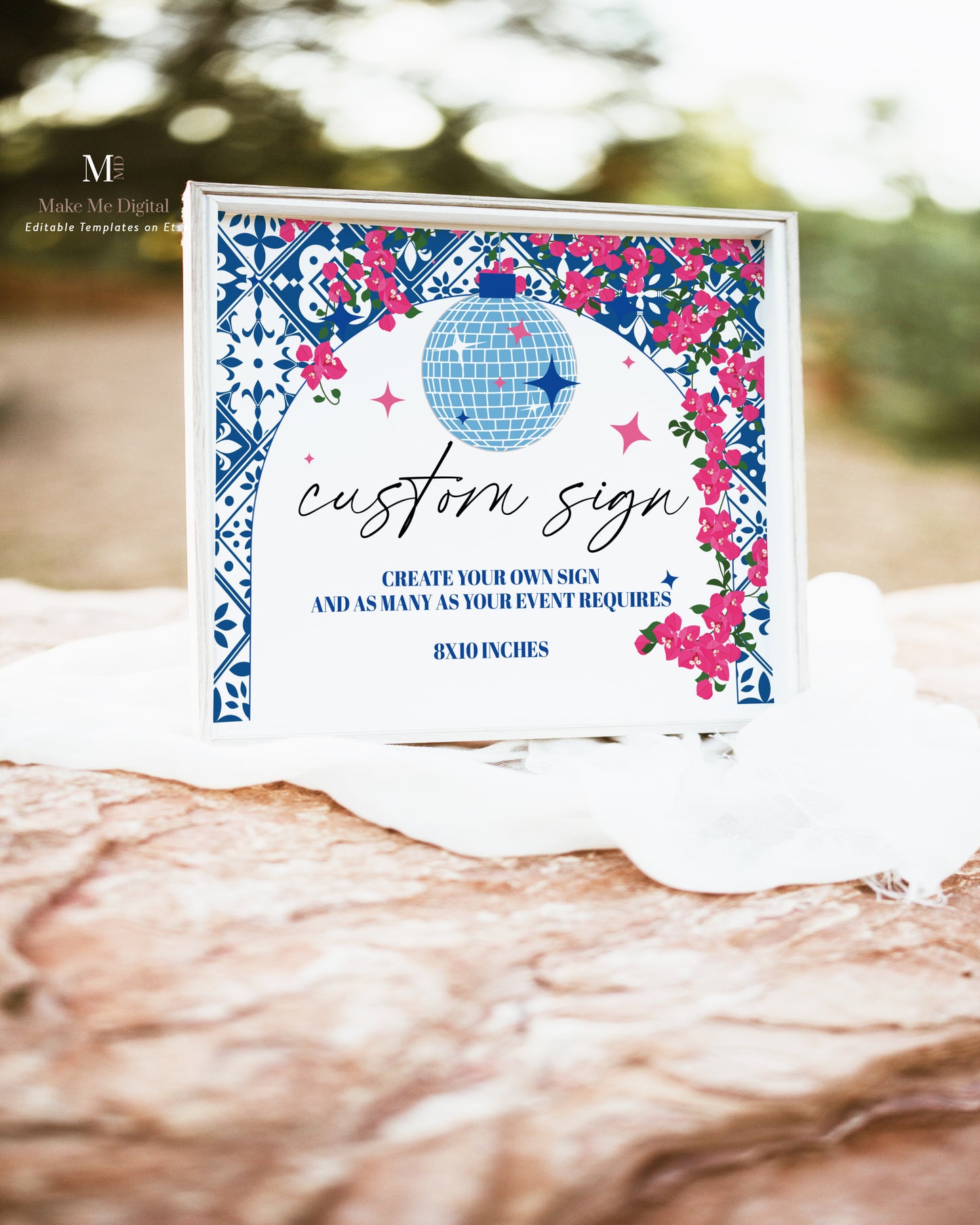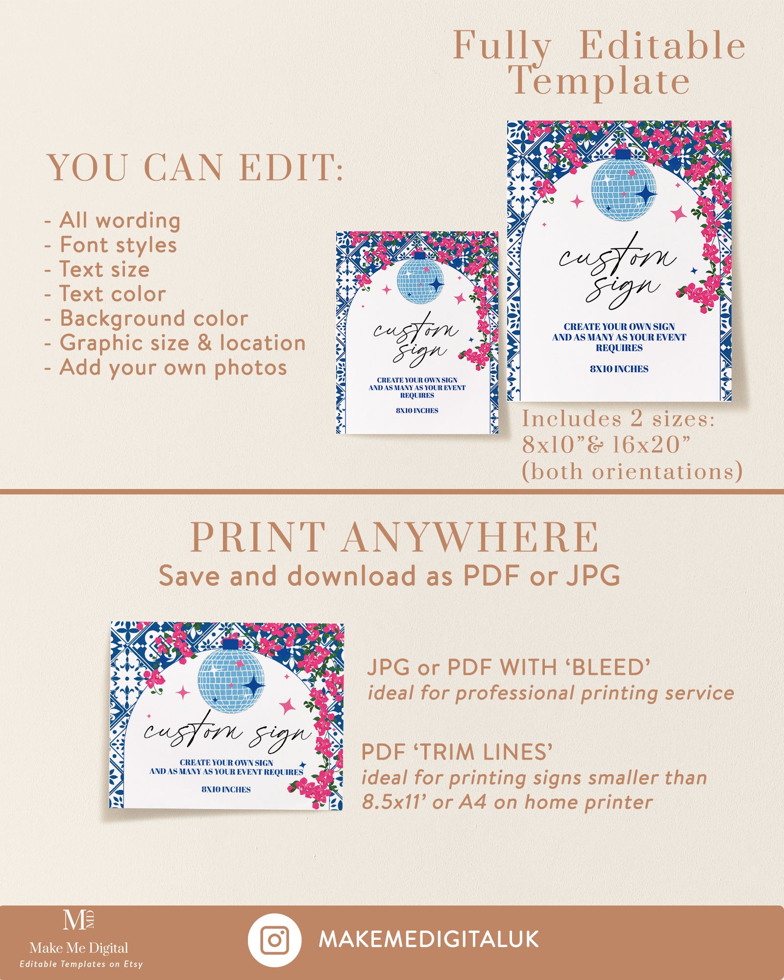 Save time, money, and wow your guests by printing your Greek 70s-inspired hen party custom sign! Edit all the wording, colors, fonts, and icons to match your event needs.