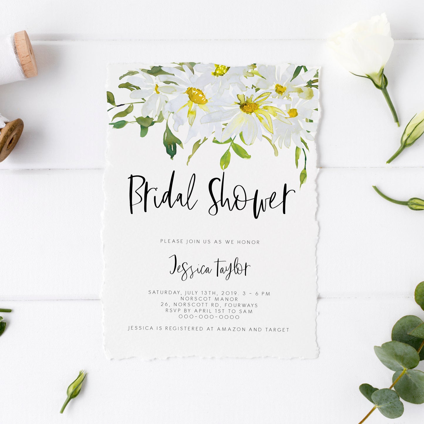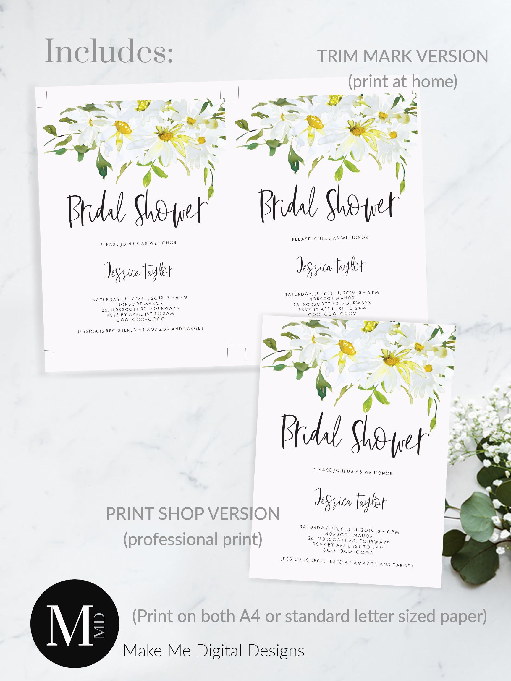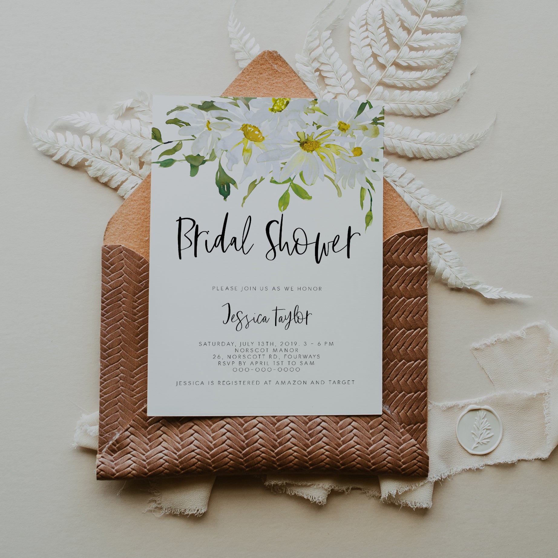 Save time, money, and wow your guests by printing your own floral daisy bridal shower invitation! Edit all the wording, colors, fonts, and icons to match your event needs.