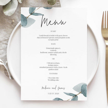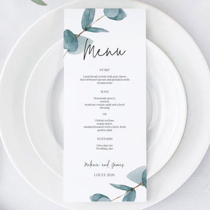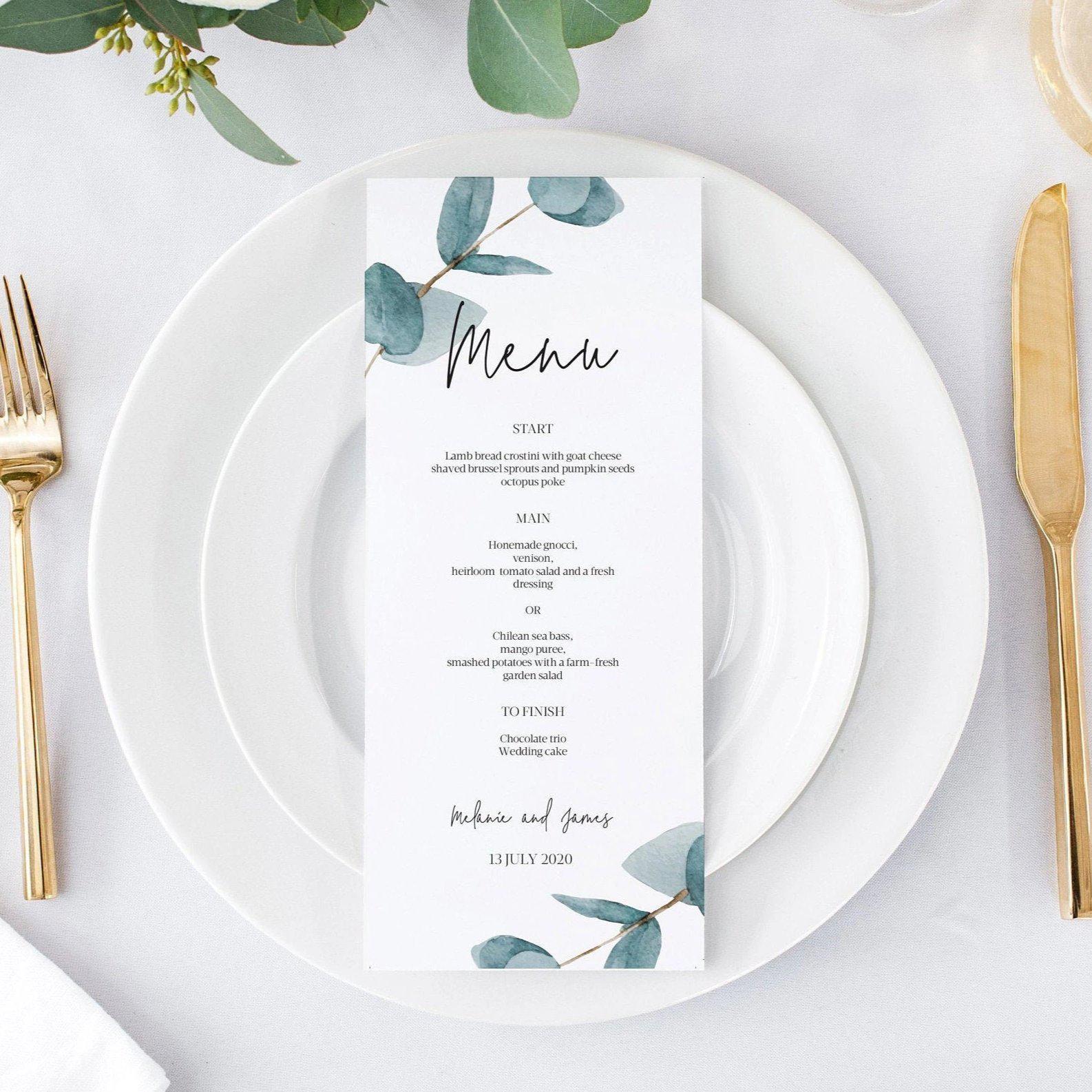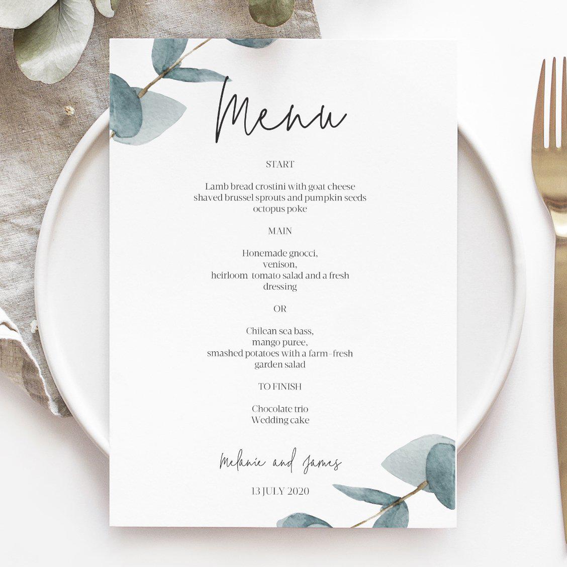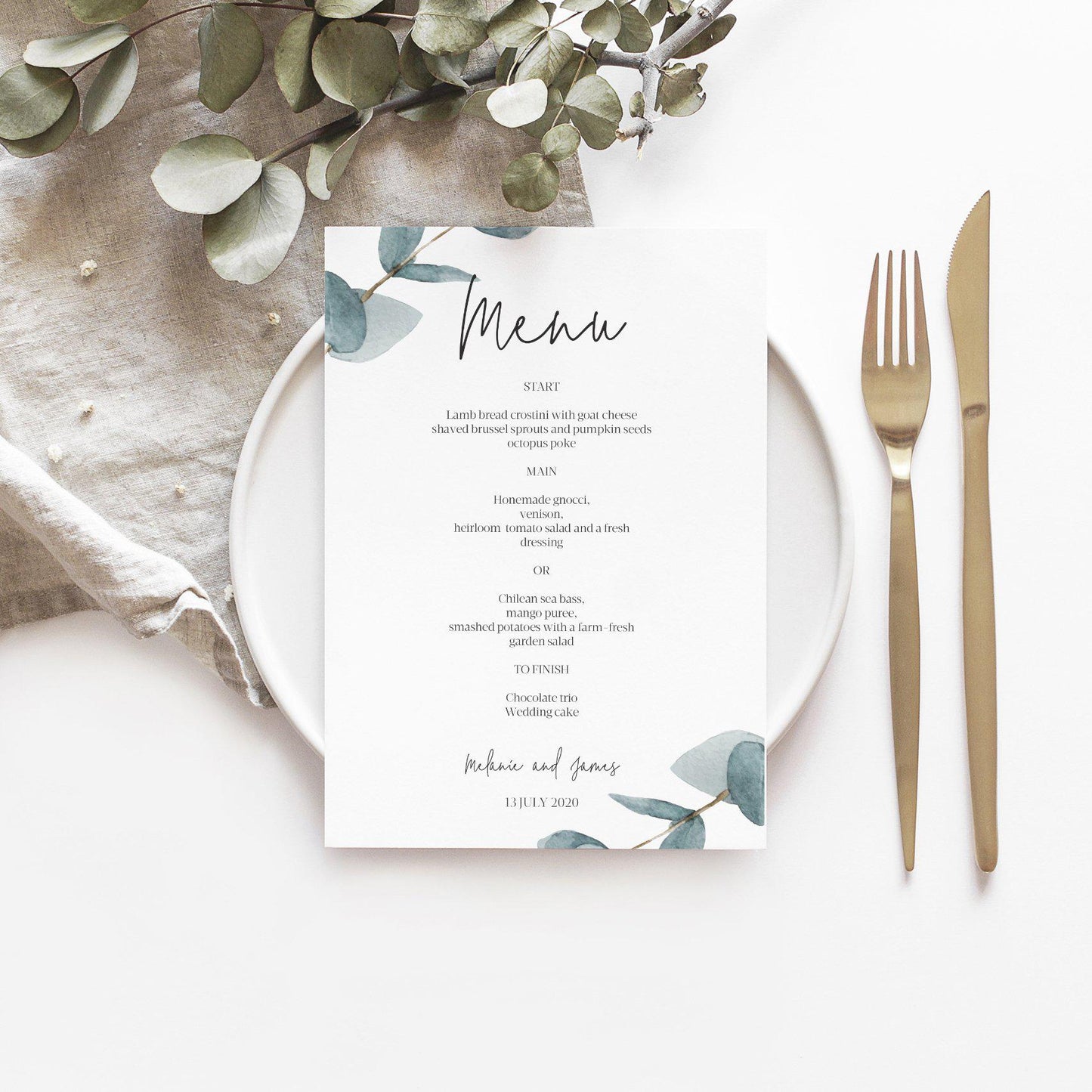 Please note that this is a digital blue eucalyptus menu template to download only, no physical product will be shipped.