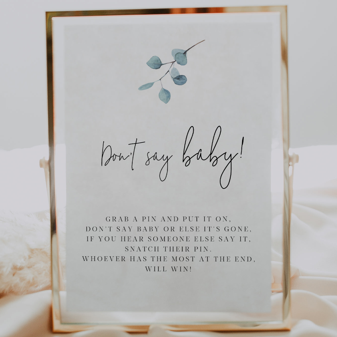 Save time, money, and wow your guests by printing your own eucalyptus don't say baby game sign! Edit all the wording, colors, fonts, and icons to match your event needs.