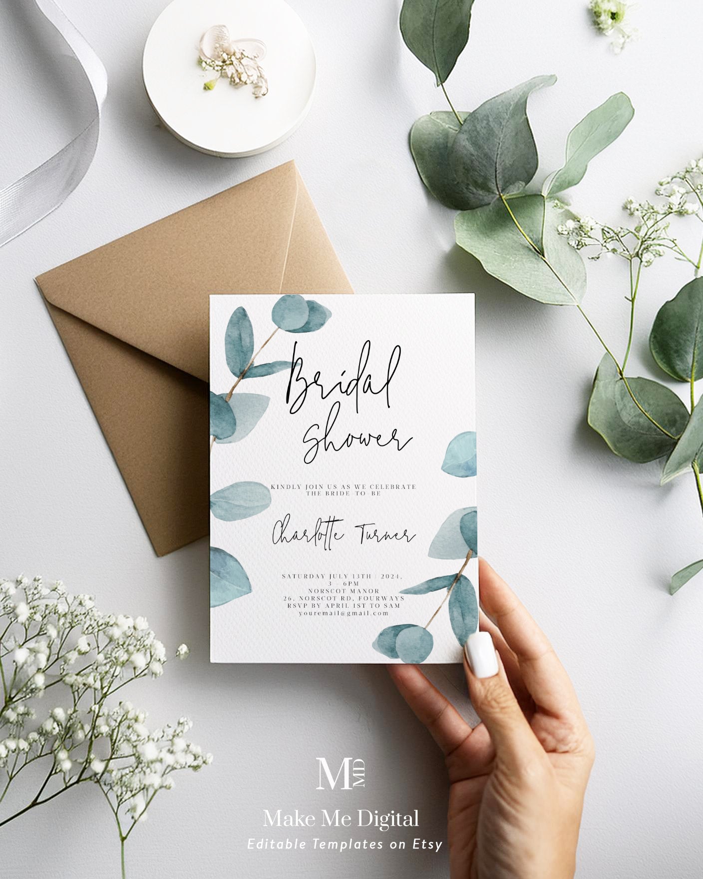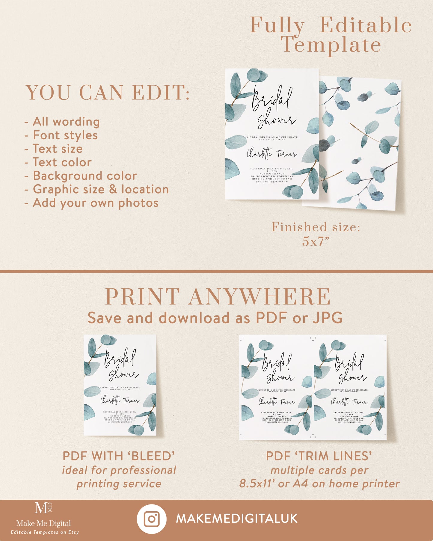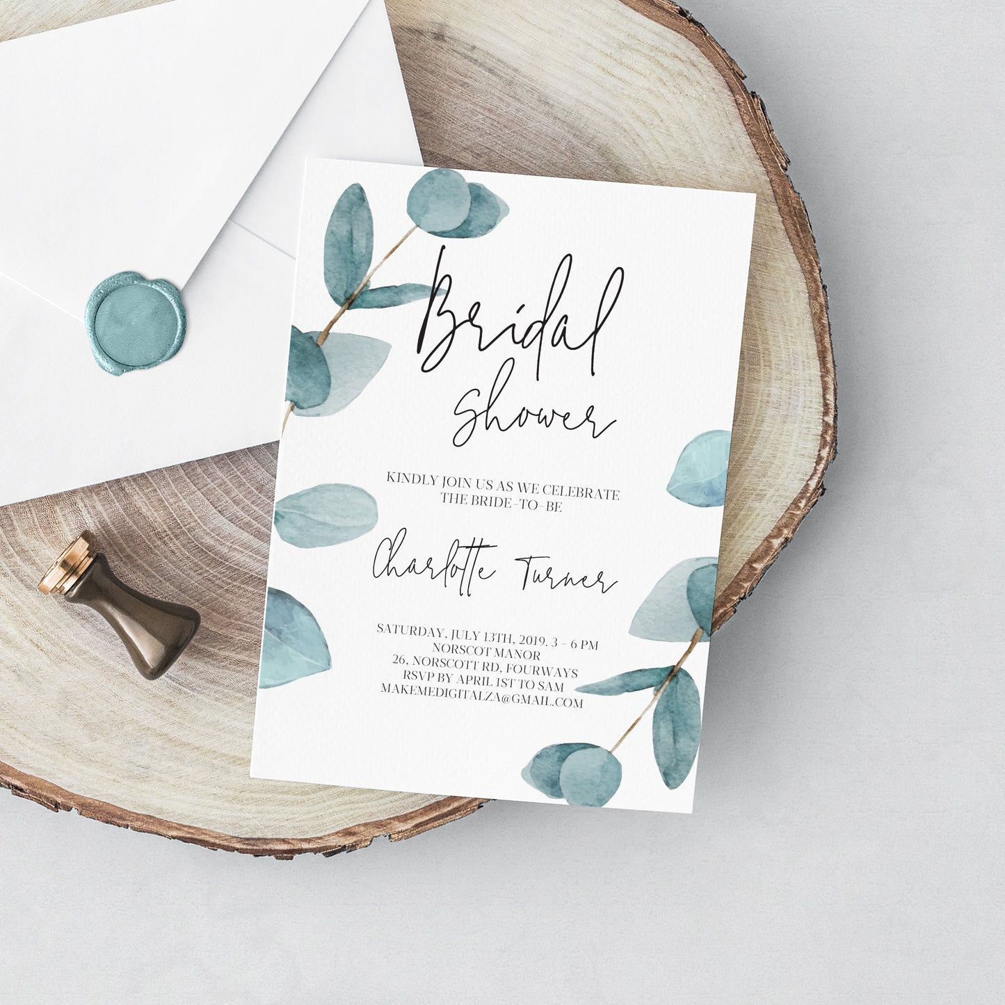 Save time, money, and wow your guests by printing your own elegant eucalyptus bridal shower invitation! Edit all the wording, colors, fonts, and icons to match your event needs.