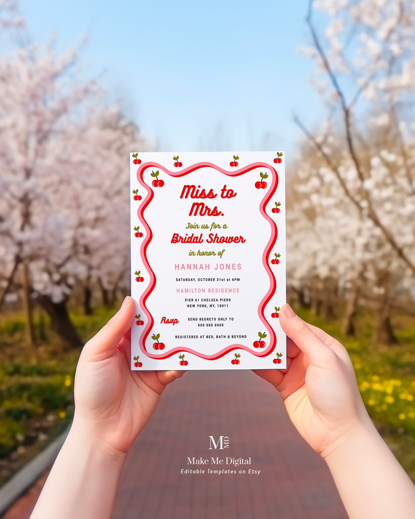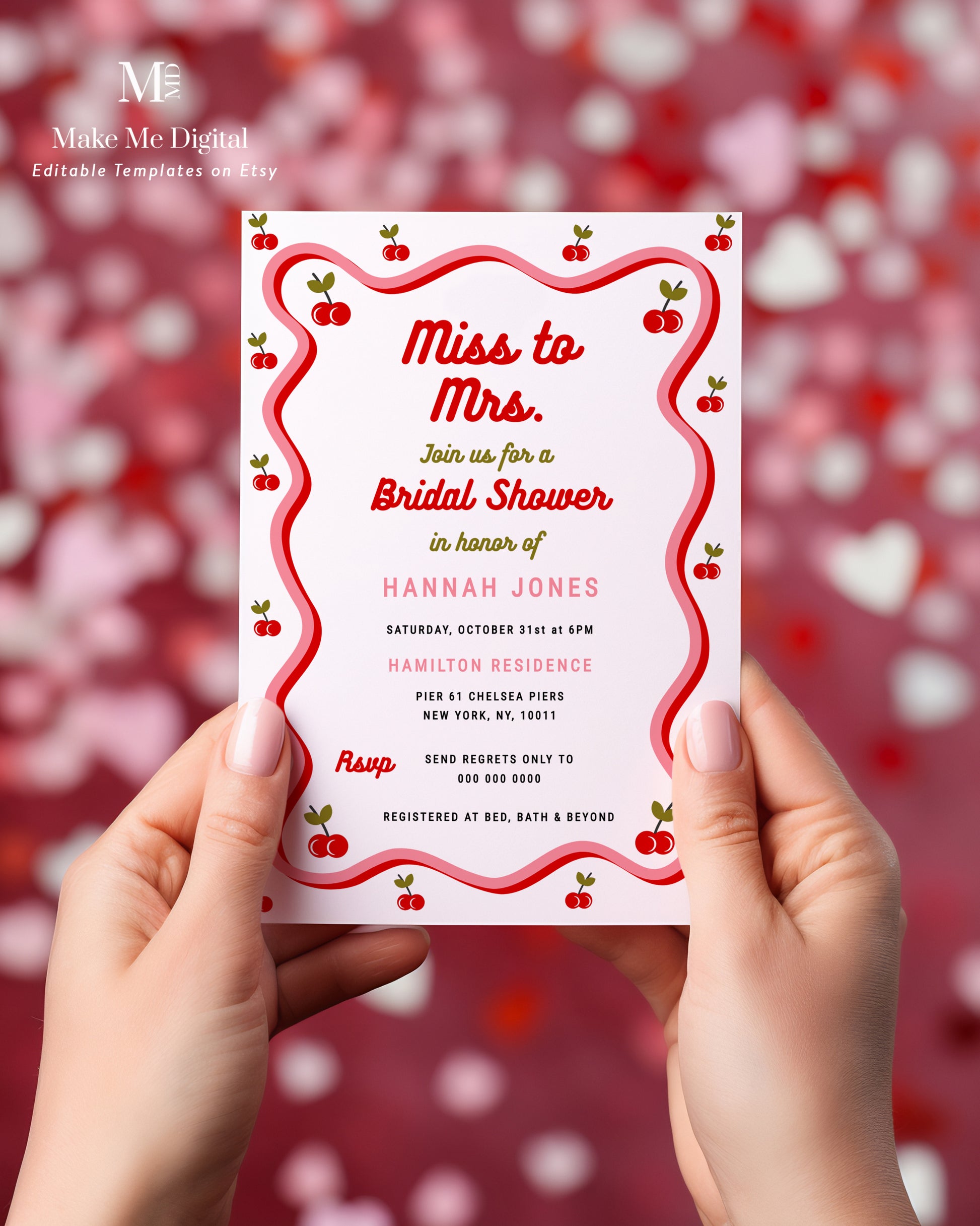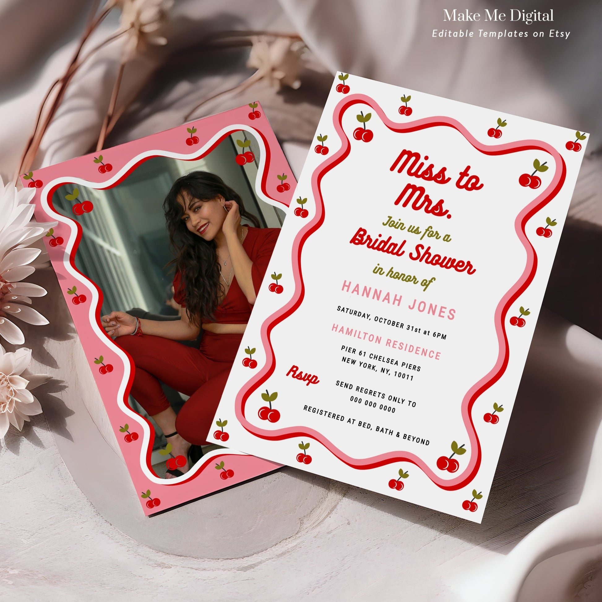 Retro wavy icing-themed Cherry Bridal Shower Photo invitation sizes included + instructions: