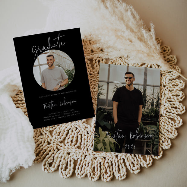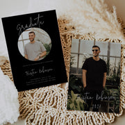 Modern Black Graduation Invitation, Calligraphy Graduation Party invite with photo, grad party invite, personalised invitation for men