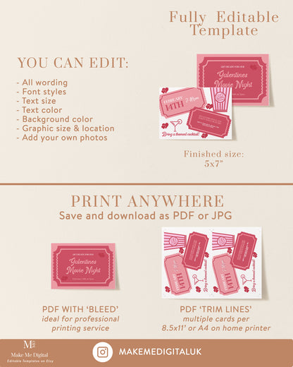 Girls Night party movie ticket themed invitation sizes included + instructions: