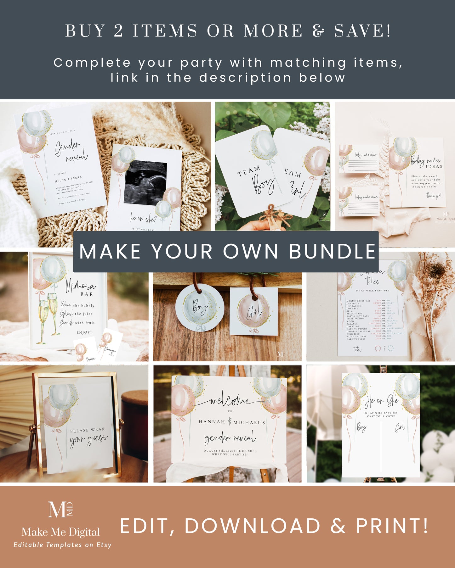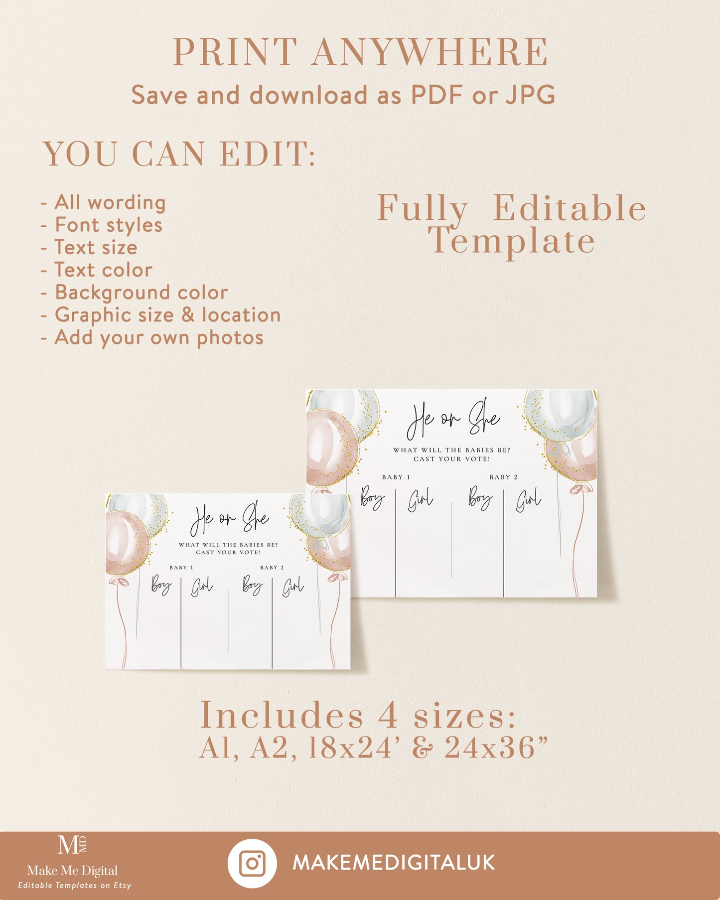 Pink and Blue Delicate Balloon "Gender Reveal" baby shower welcome sign sizes included + instructions: