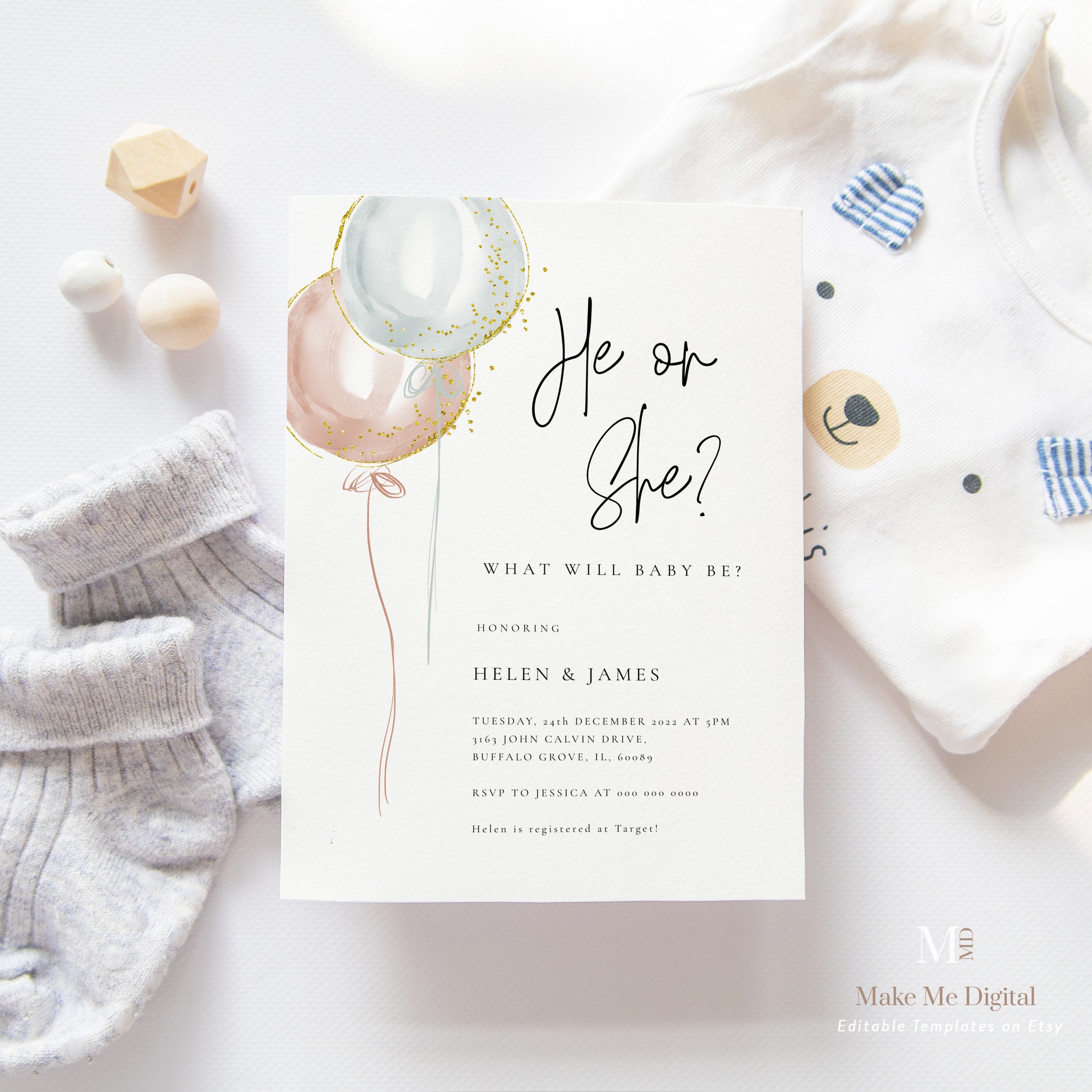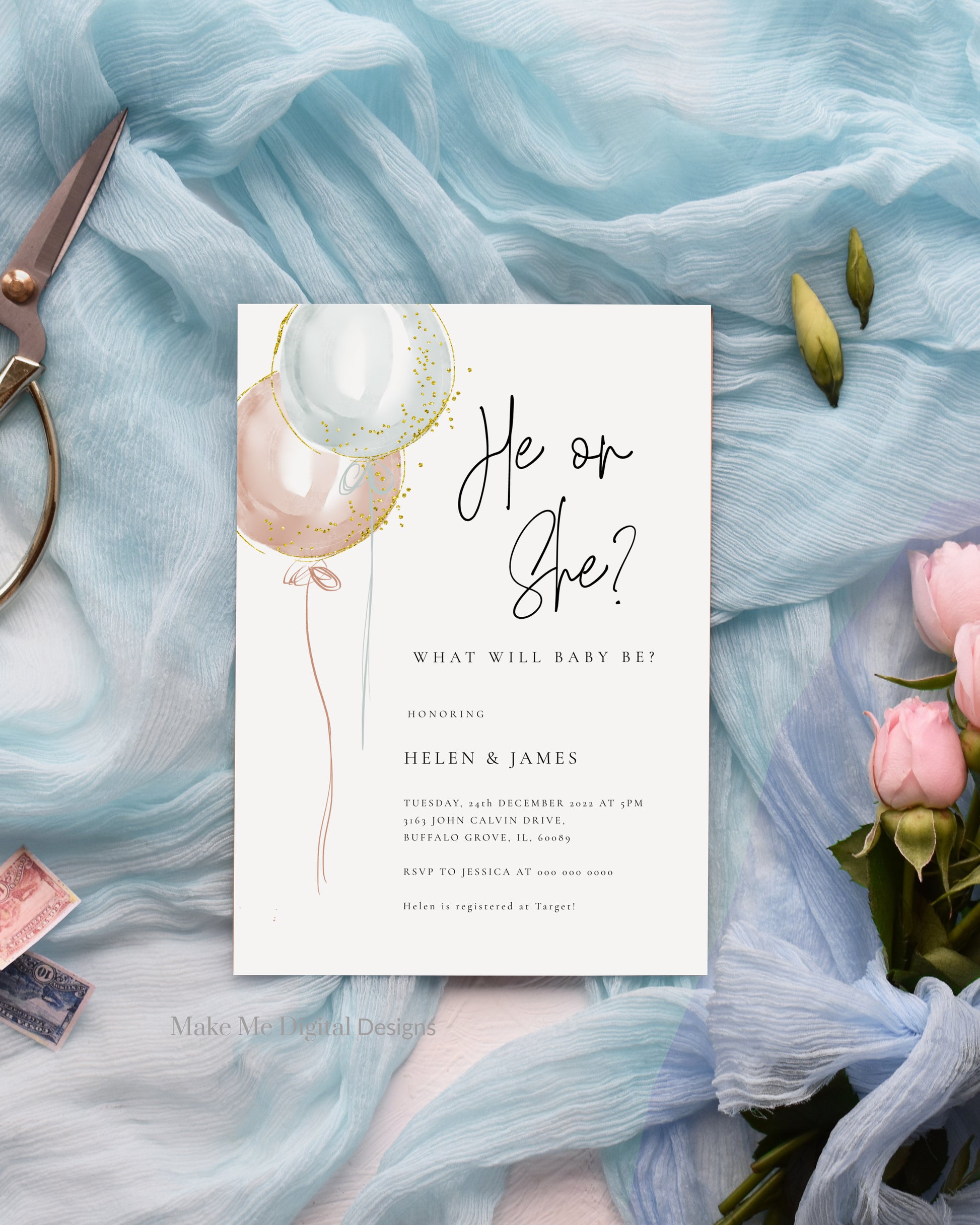 Pink and Blue He or She Delicate BalloonĀ "Gender Reveal"Ā baby shower inviteĀ sizes included + instructions: