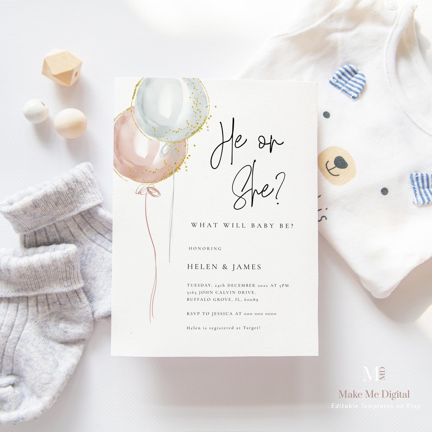 Pink & Blue HE OR SHE Balloon Gender Reveal Invitation template