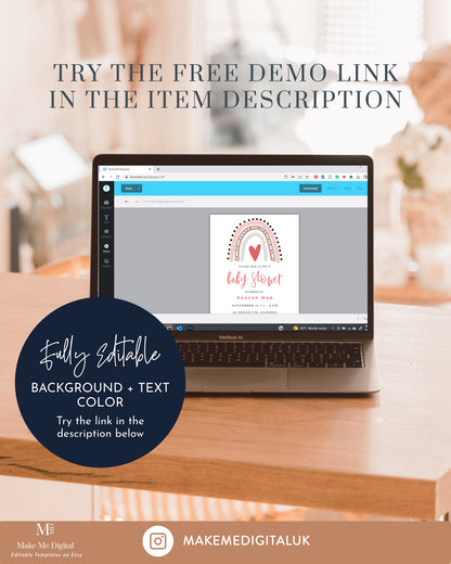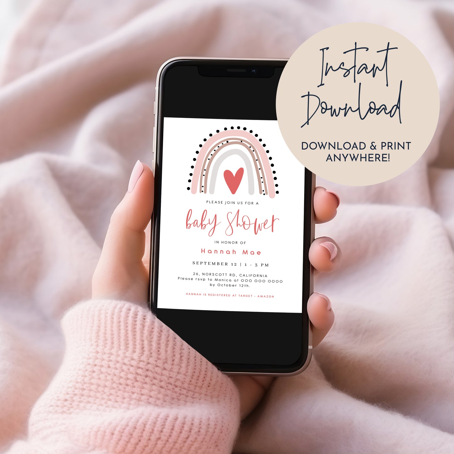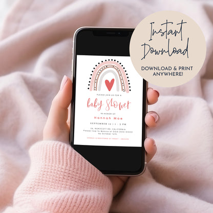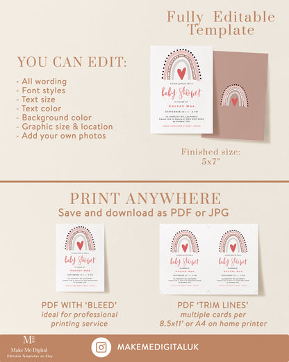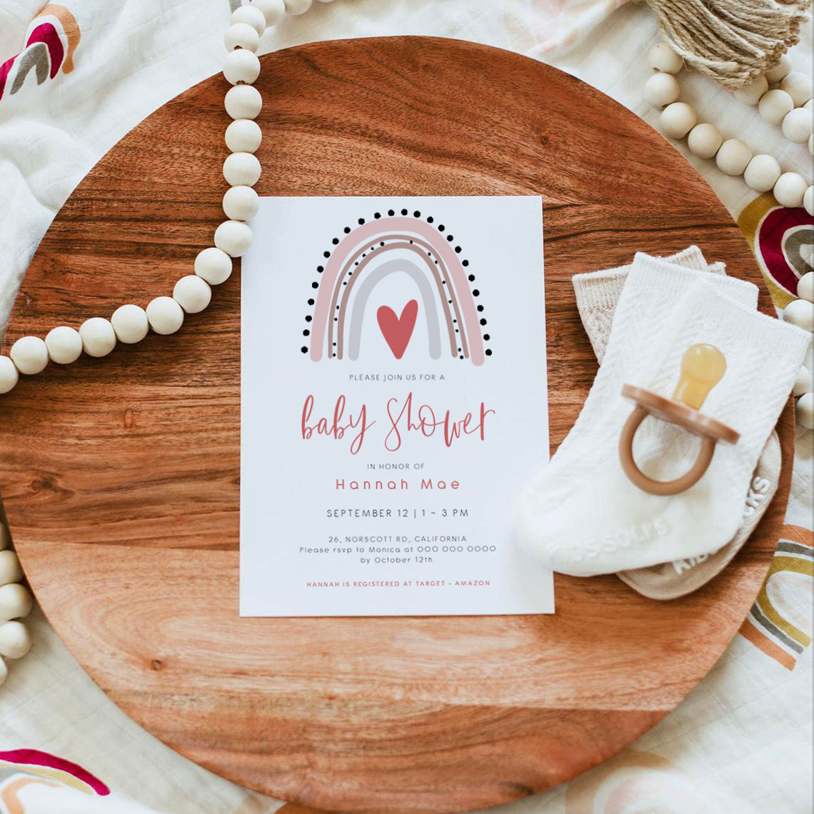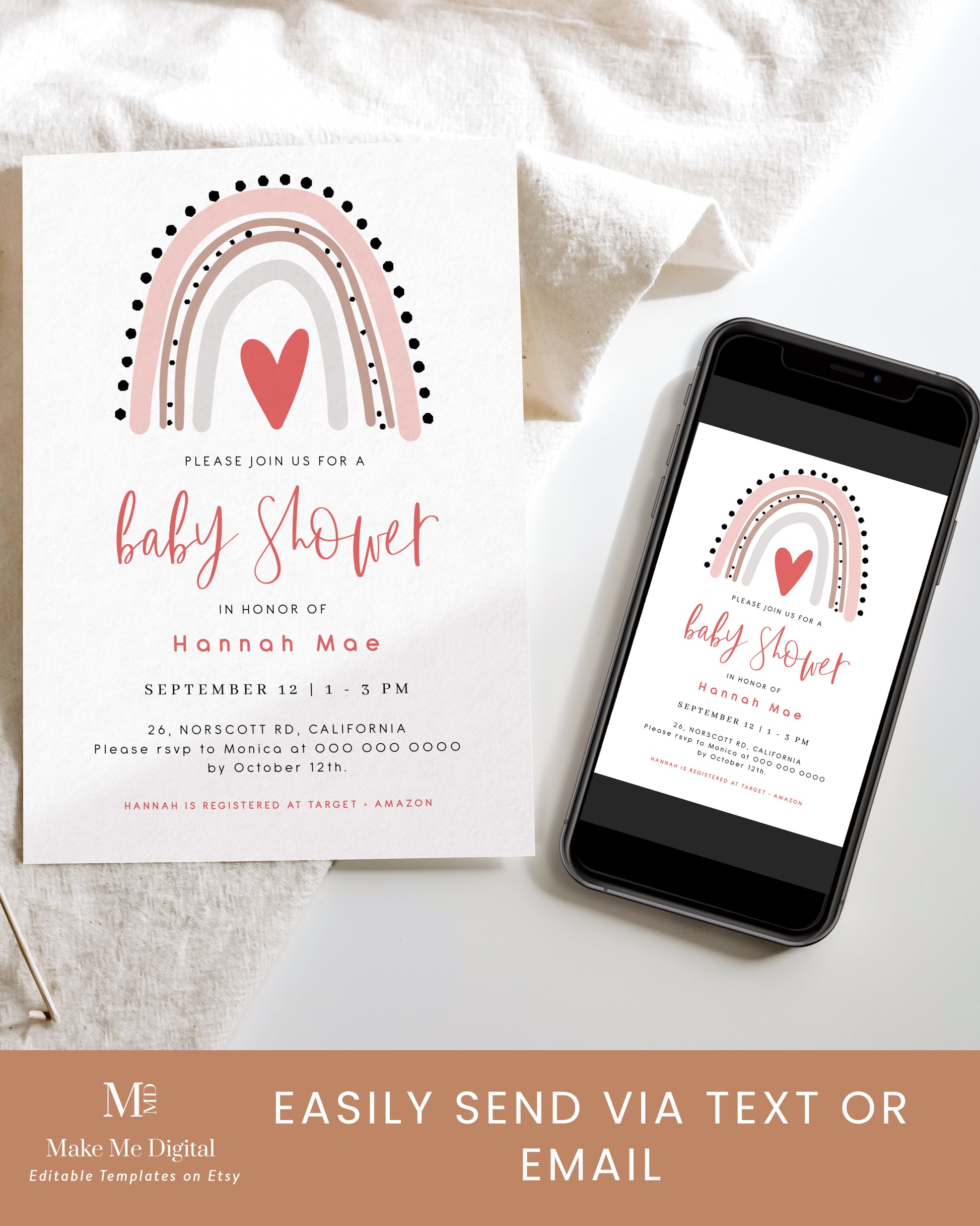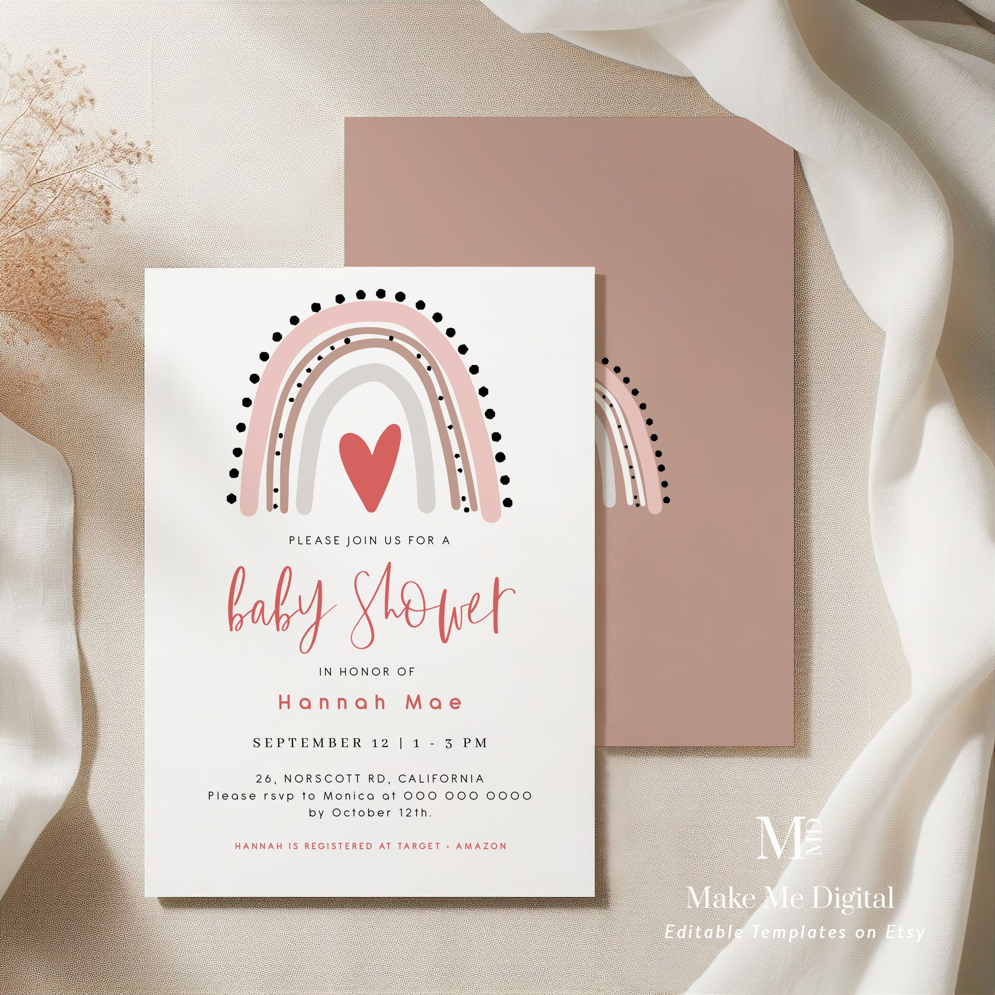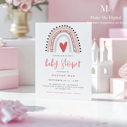 Save time, money, and wow your guests by printing your own boho pink baby shower invitation! Edit all the wording, colors, fonts, and icons to match your event needs.
