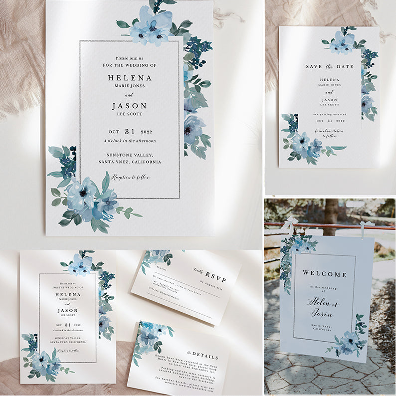 Porcelain Blue Floral Wedding Stationery Bundle item sizes included + instructions: