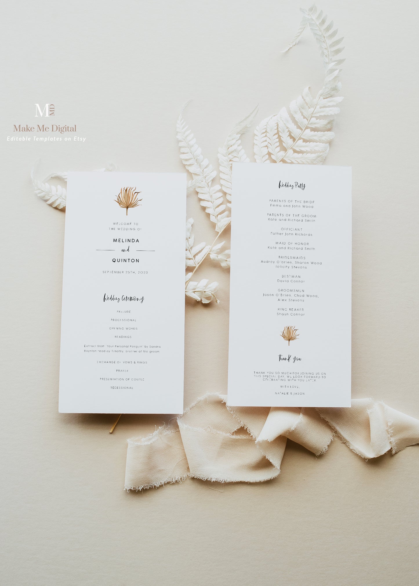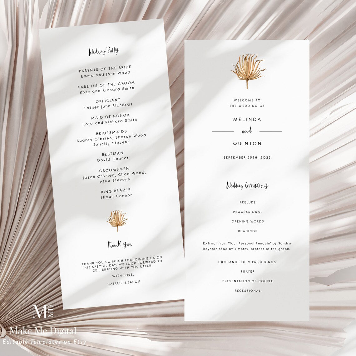 Save time, money, and wow your guests by printing your own rustic palm leaf wedding program! Edit all the wording, colors, fonts, and icons to match your event needs.