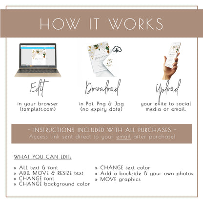 These templates can be accessed through TEMPLETT.COM; an online editor that allows you to personalize your templates without installing any software or fonts. You will receive an email from TEMPLETT.COM just moments after purchase to begin personalizing your templates. Edit, download, and print at home or with any printing center