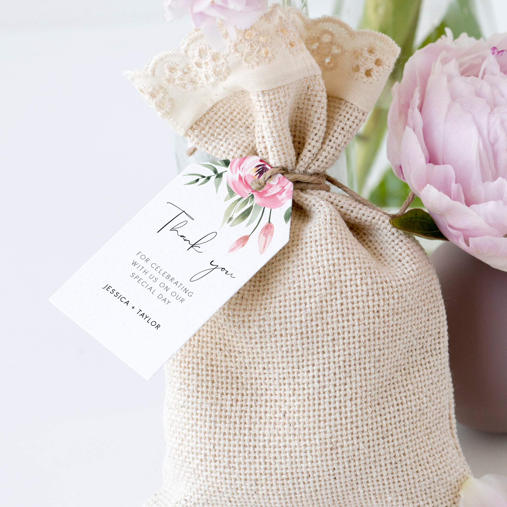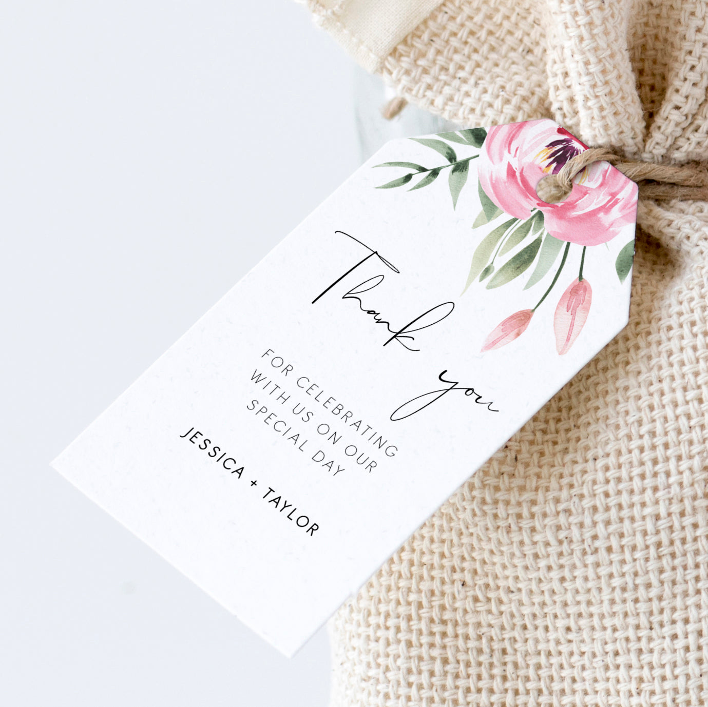 Save time, money, and wow your guests by printing your own pink peony wedding favor tags! Edit all the wording, colors, fonts, and icons to match your event needs.