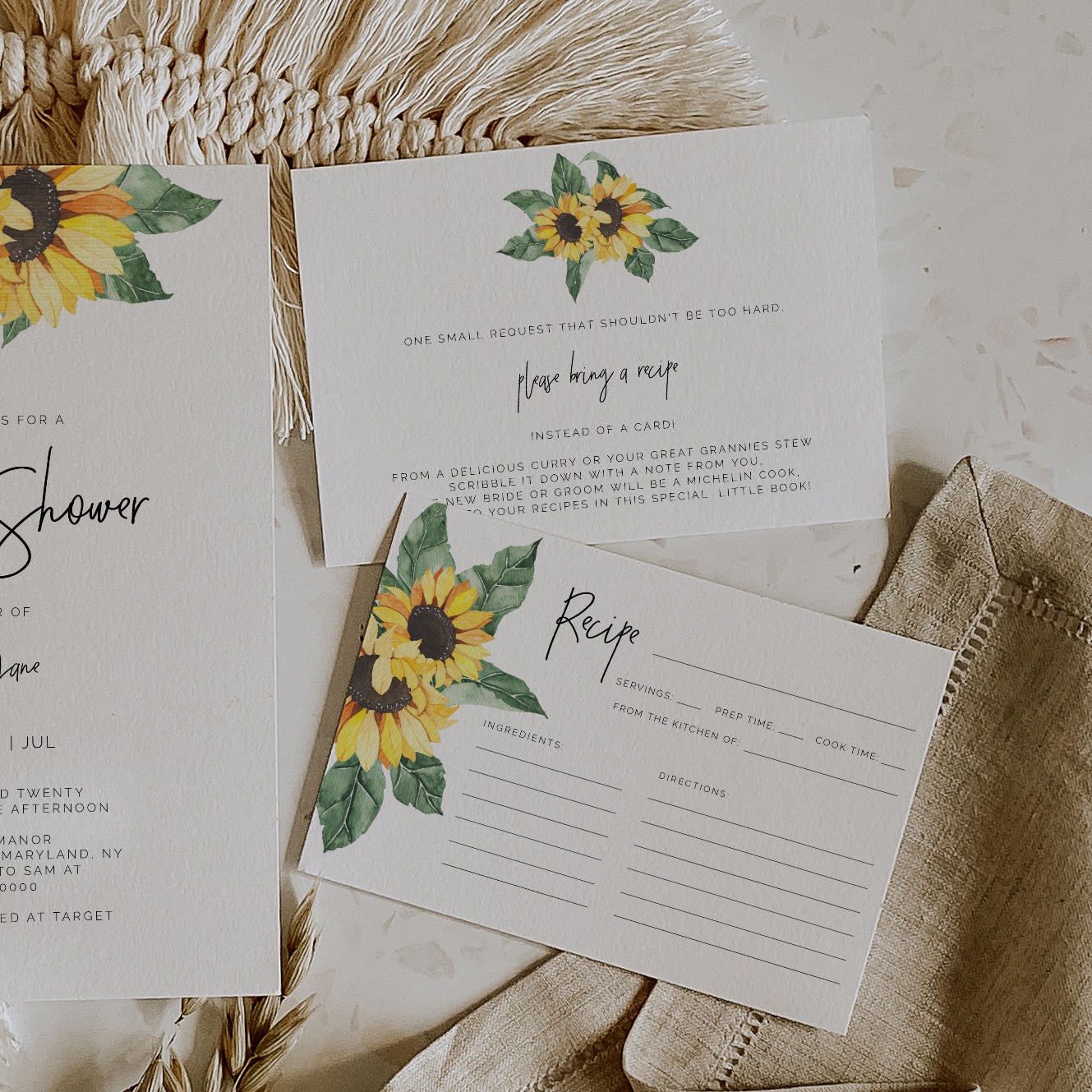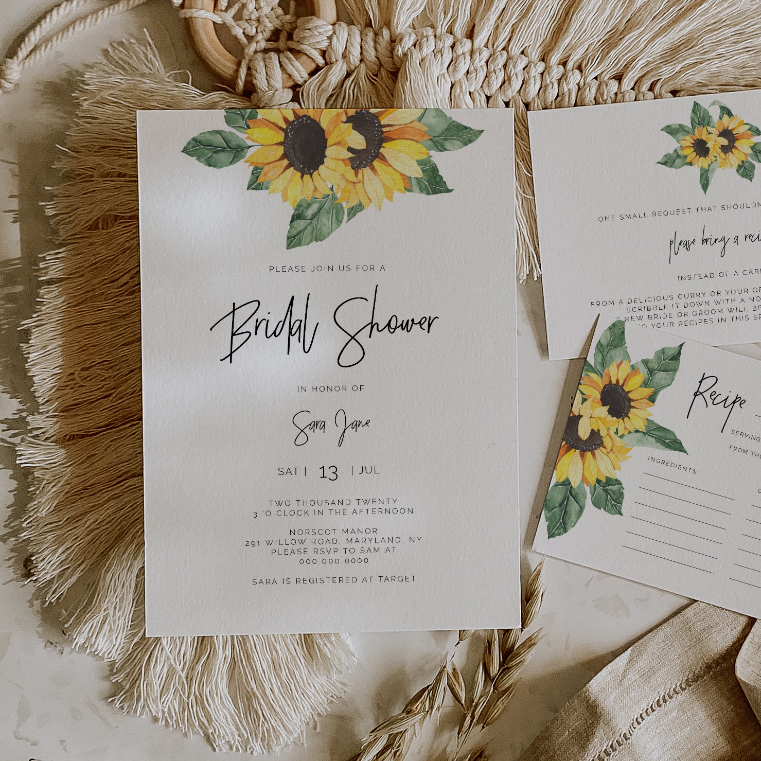 Save time, money, and wow your guests by printing your own rustic sunflower bridal shower invitation set! Edit all the wording, colors, fonts, and icons to match your event needs.