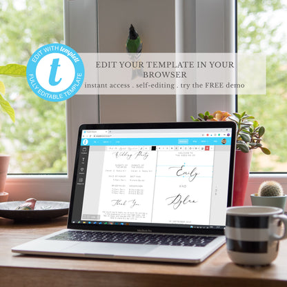 Templett is an online editor that allows you to personalize your templates without installing any fonts or software. You can open Templett in any internet window (works best in Chrome), edit, and download print your wedding templates in minutes - saving you money along the way.