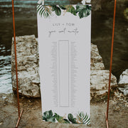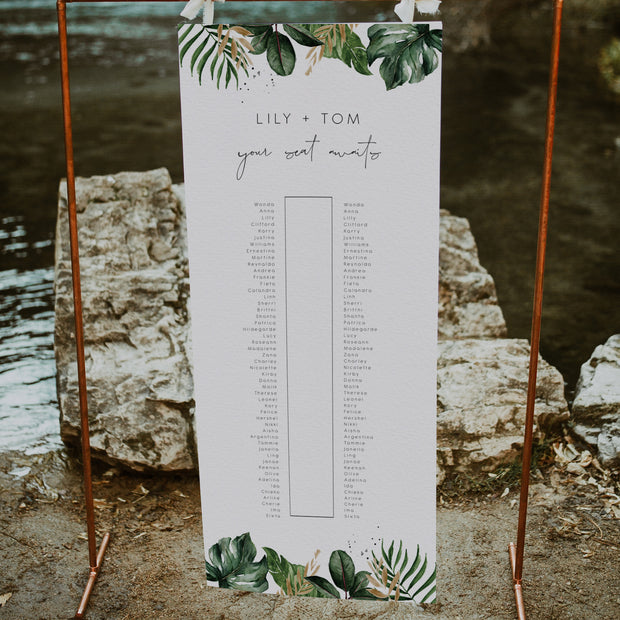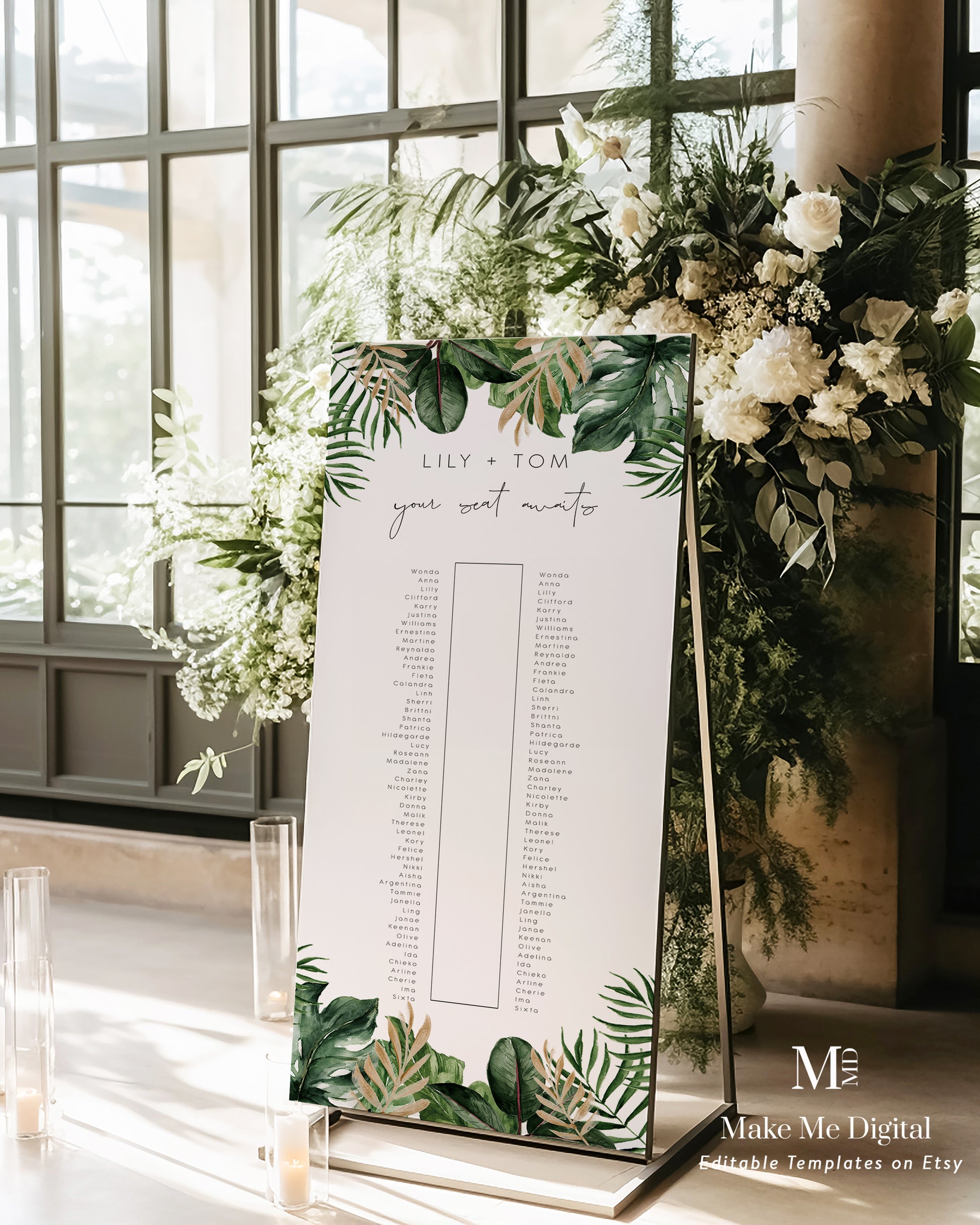 Long Tropical Seating Chart Sign Wedding Sign Hanging Find your seat Wedding Sign Printable green leaf Instant Download Seating DIY
