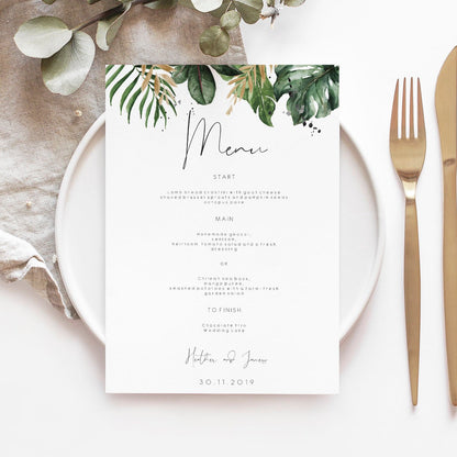 Printable Tropical Menu - Wedding menus - Wedding Menu card - wedding printable - wedding dinner menu - menu template - menu cards - Printable menu cards - Instant Download - Tropical wedding menu - beach wedding - palm leaf menu - banana leaf menu