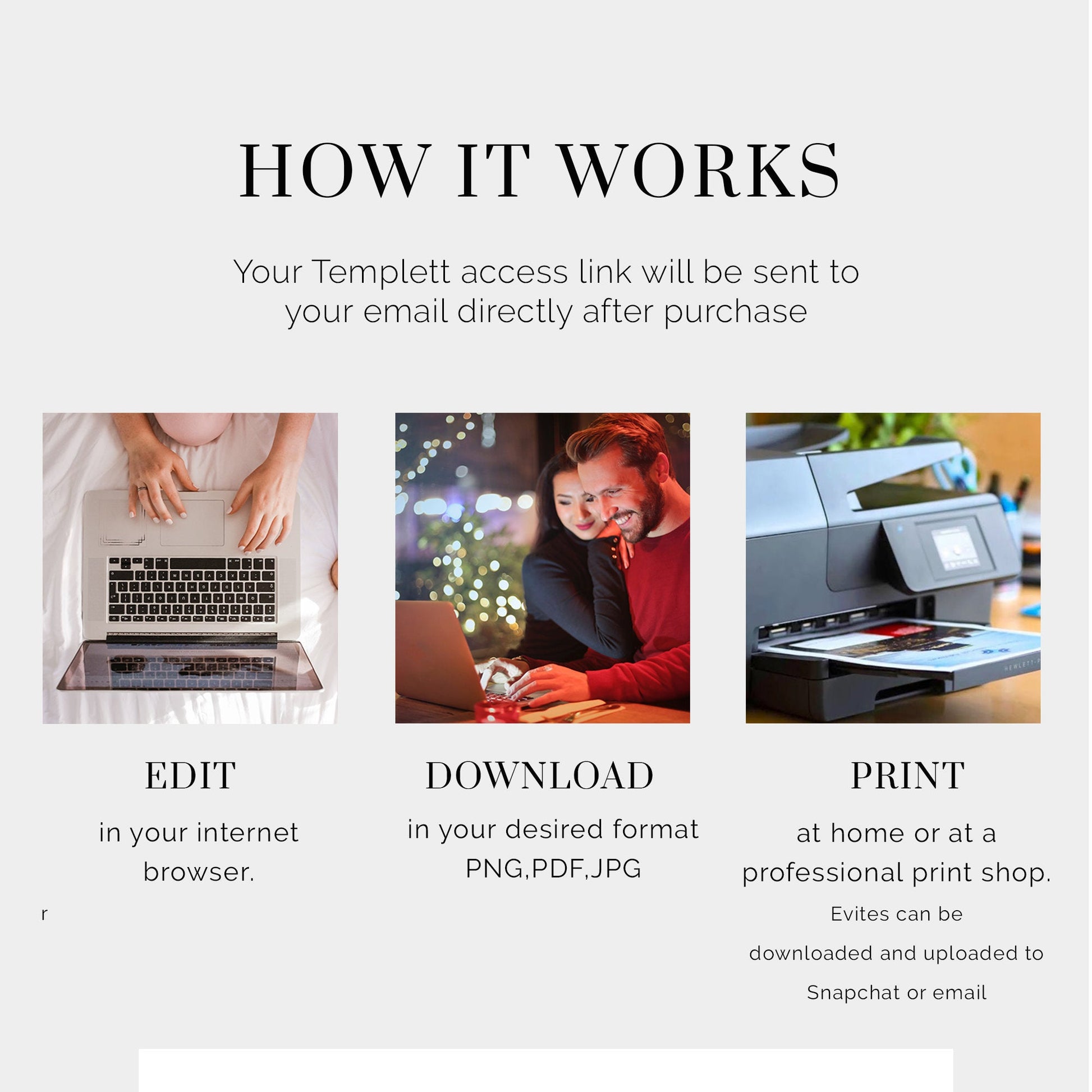 These templates can be accessed through TEMPLETT.COM; an online editor that allows you to personalize your templates without installing any software or fonts. You will receive an email from TEMPLETT.COM just moments after purchase to begin personalizing your templates. Edit, download, and print at home or with any printing center.