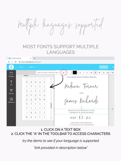 Templett is an online editor that allows you to personalize your templates without installing any fonts or software. You can open Templett in any internet window (works best in Chrome), edit, and download print your wedding templates in minutes - saving you money along the way.