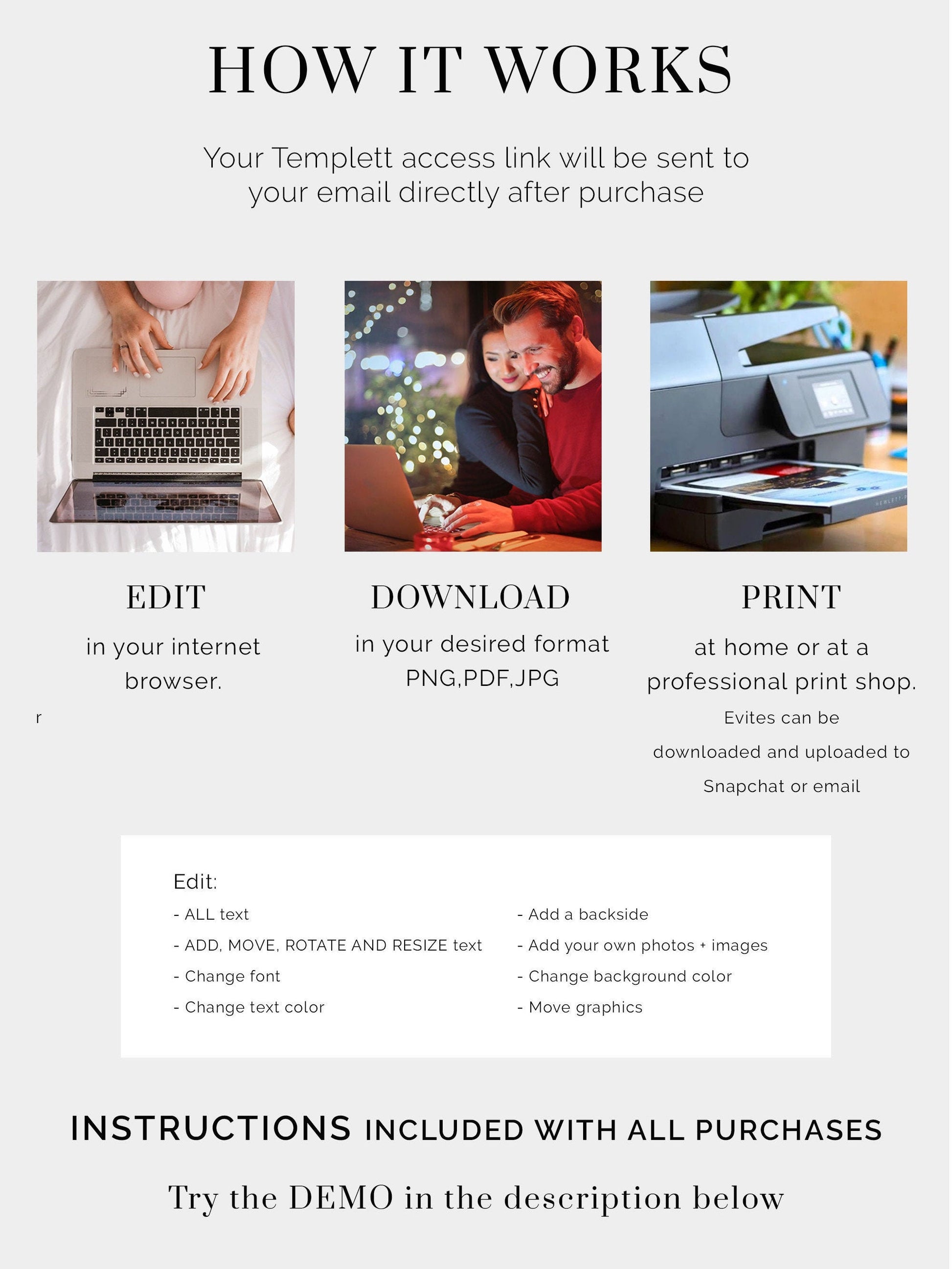 The editing instructions are emailed to you in the thank you email directly after purchase and are available within the Templett design window.