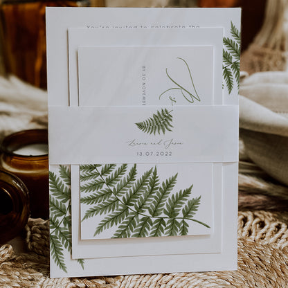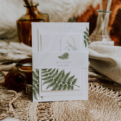 Save time, money, and wow your guests by printing your own green fern wedding invitation belly bands! Edit all the wording, colors, fonts, and icons to match your event needs.