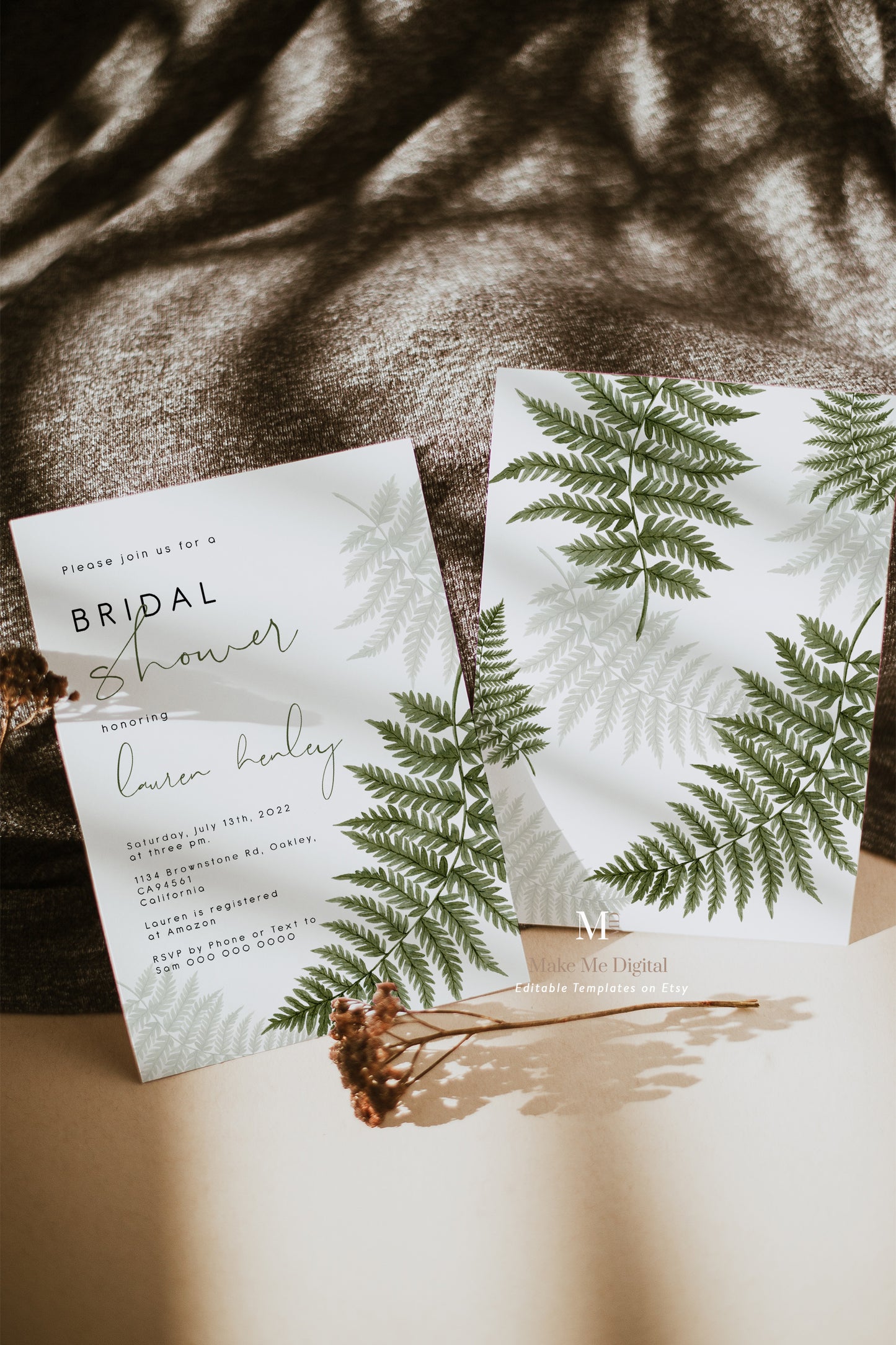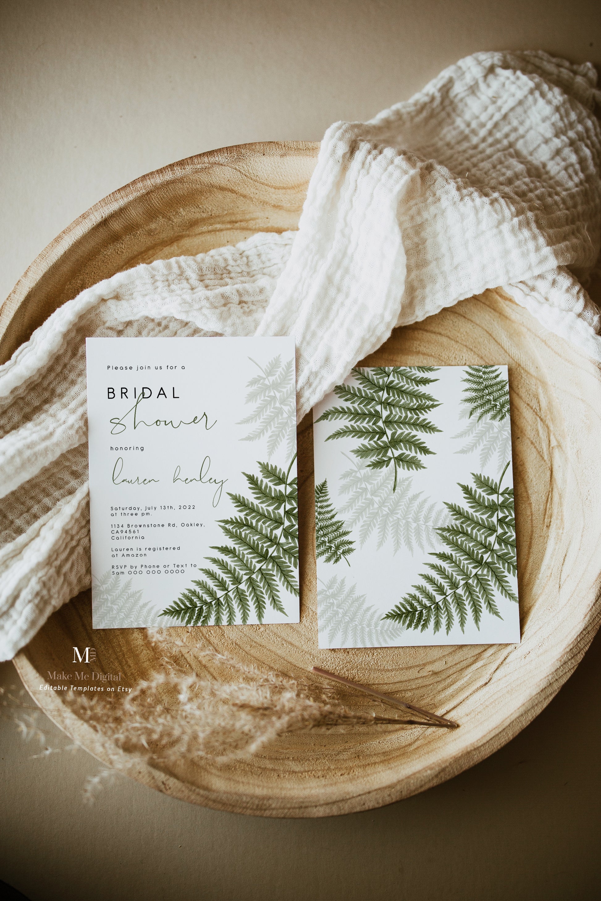 Save time, money, and wow your guests by printing your own green fern bridal shower invites! Edit all the wording, colors, fonts, and icons to match your event needs.