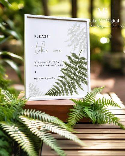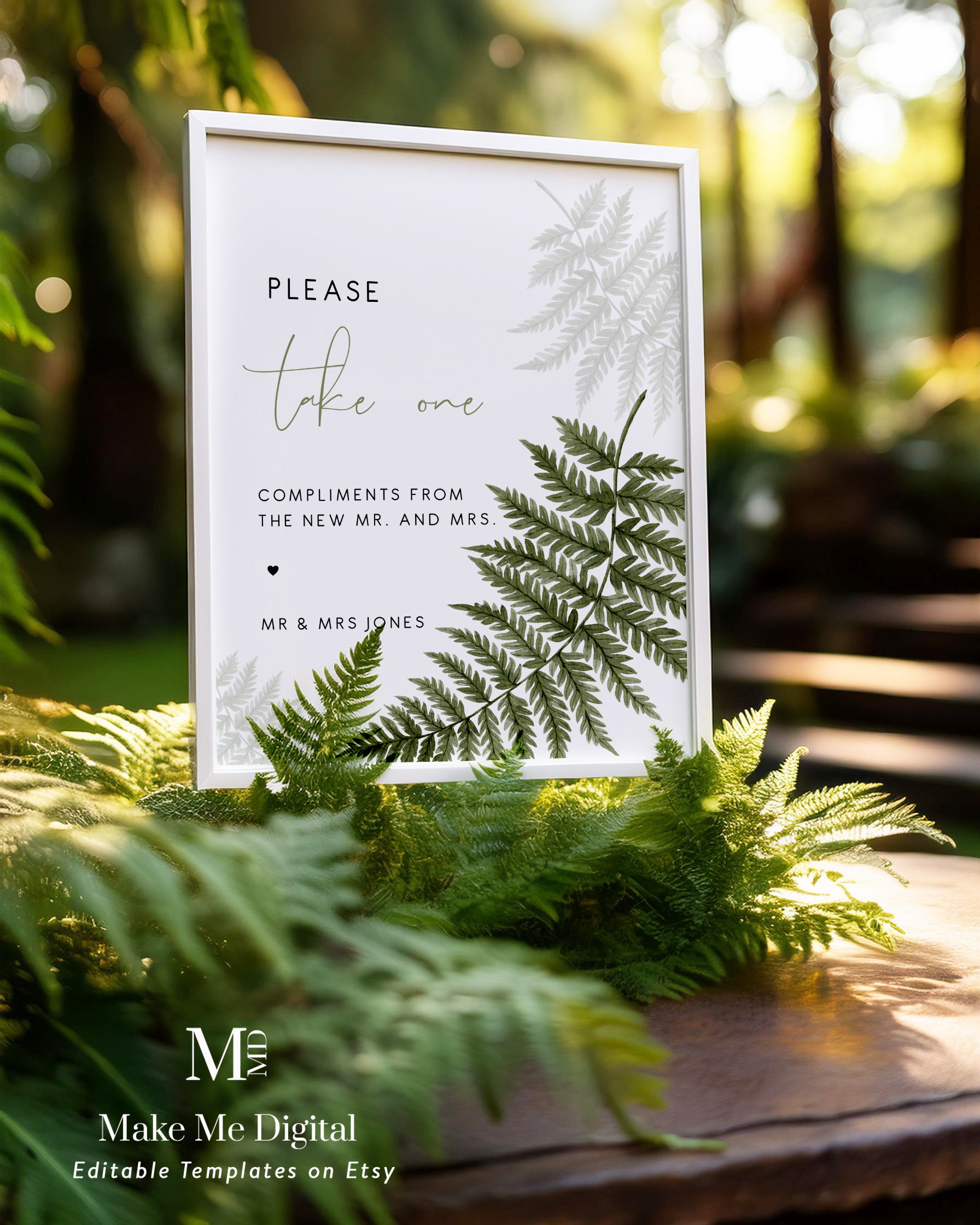 Save time, money, and wow your guests by printing your own green fern wedding party favor signs! Edit all the wording, colors, fonts, and icons to match your event needs.