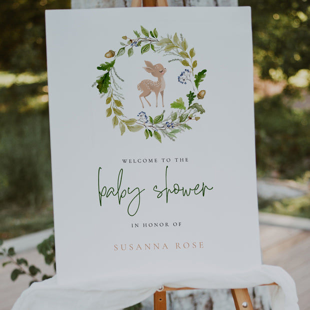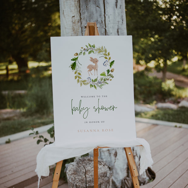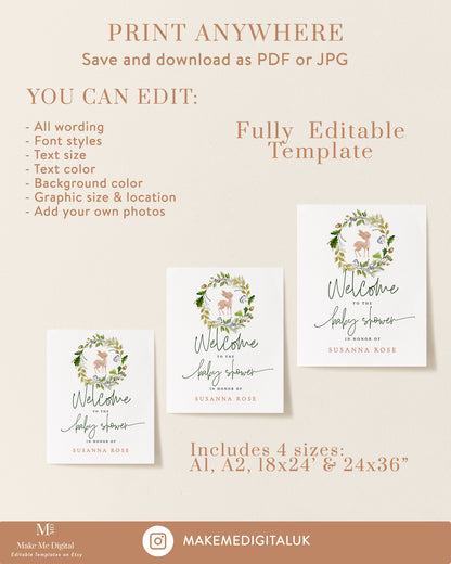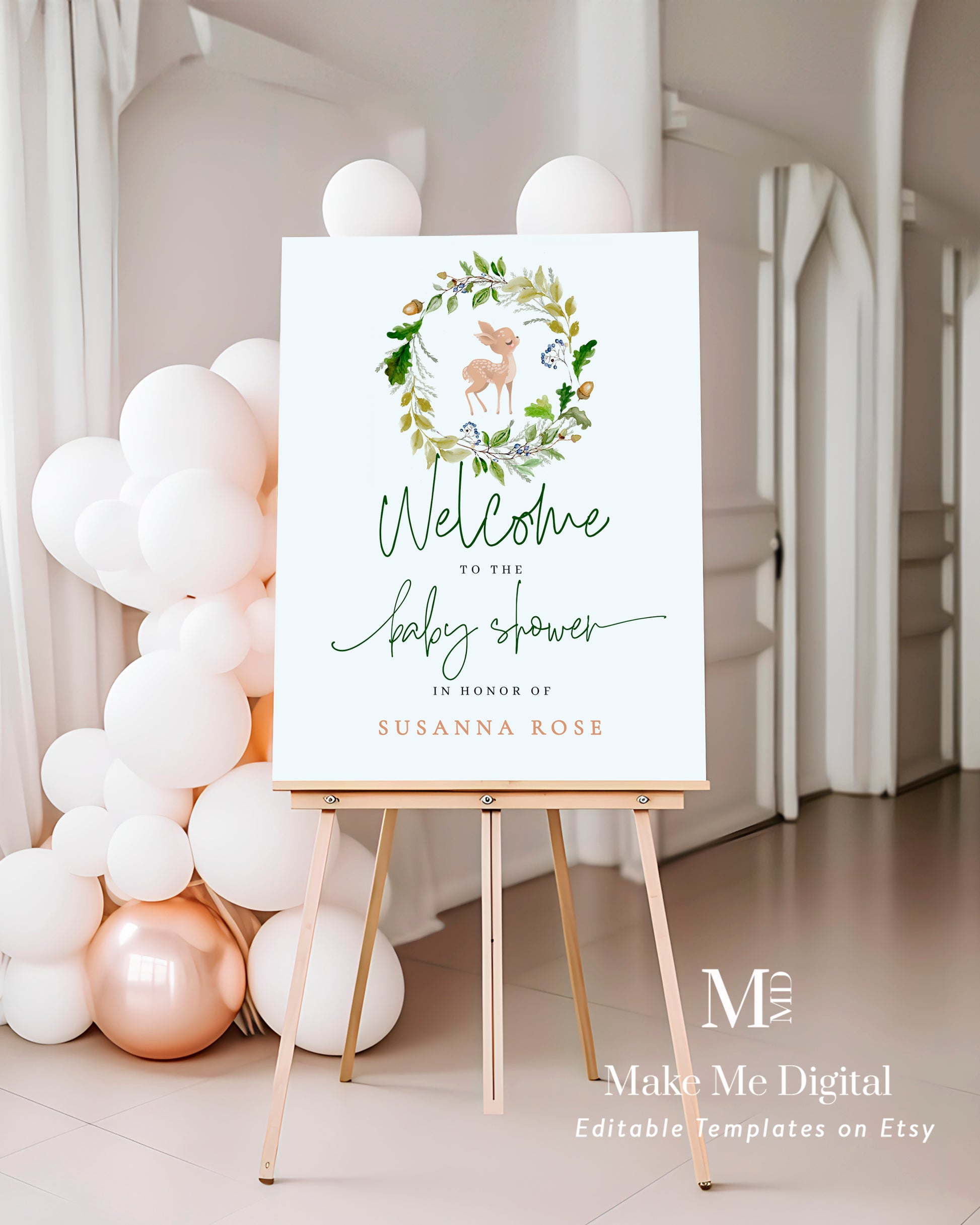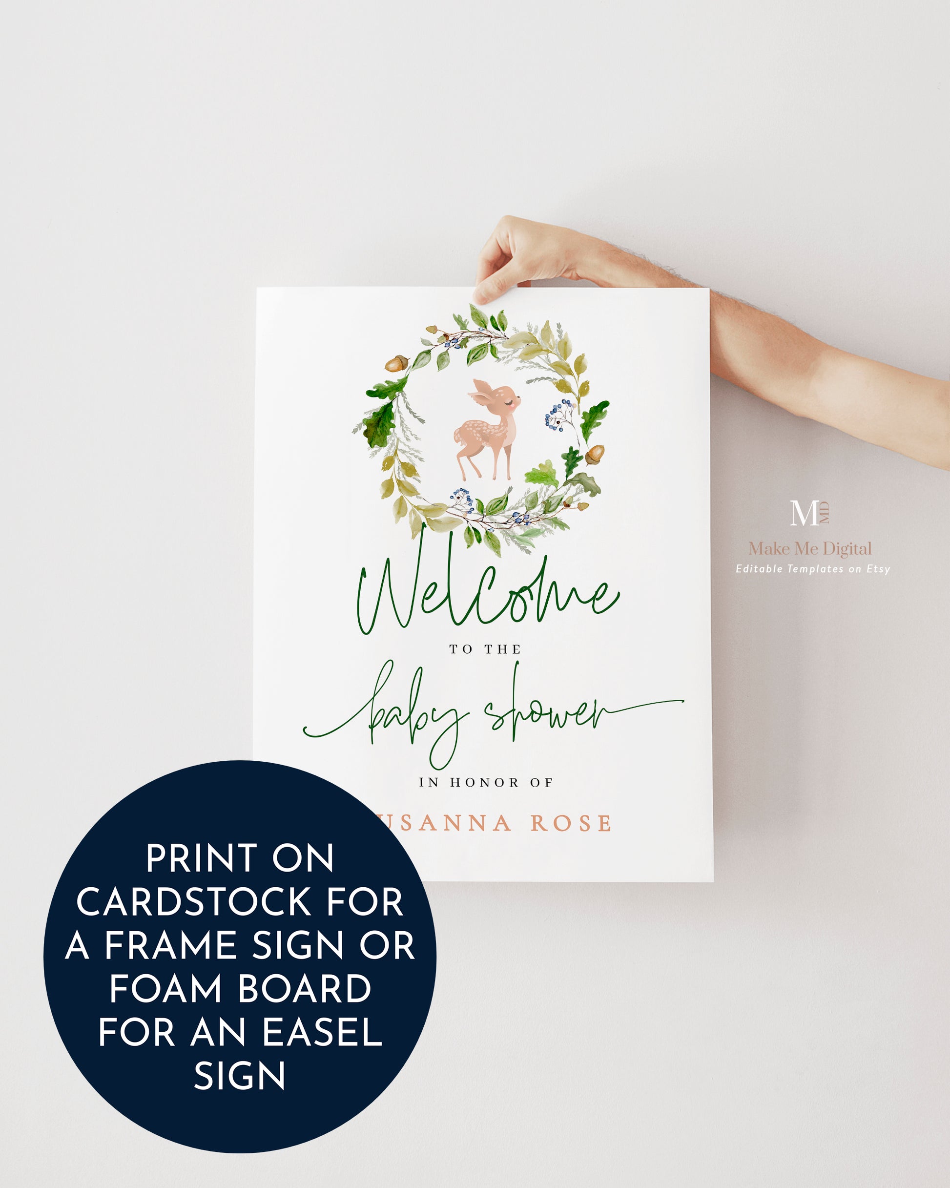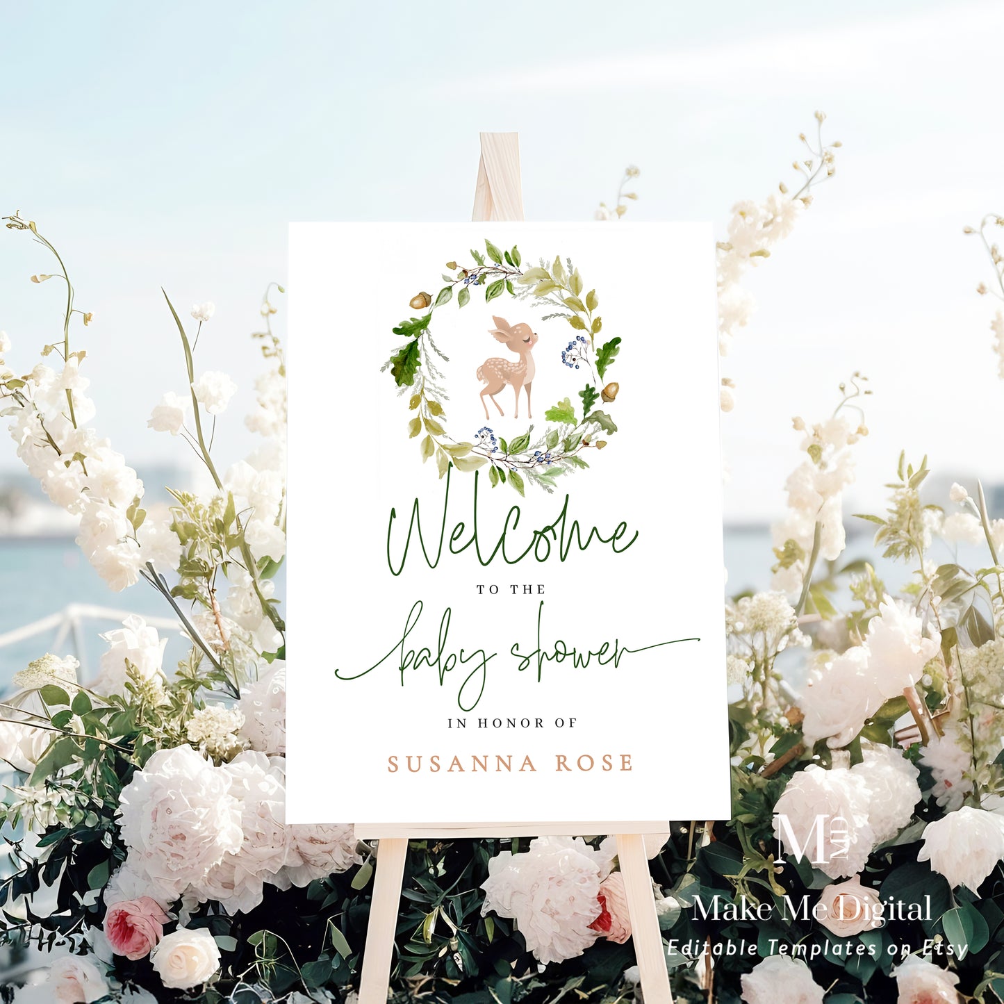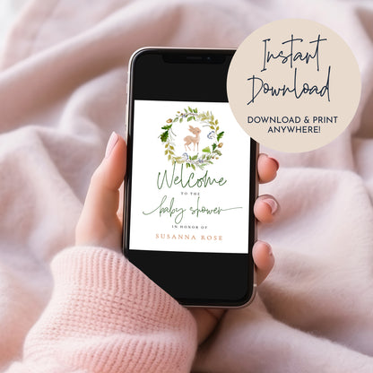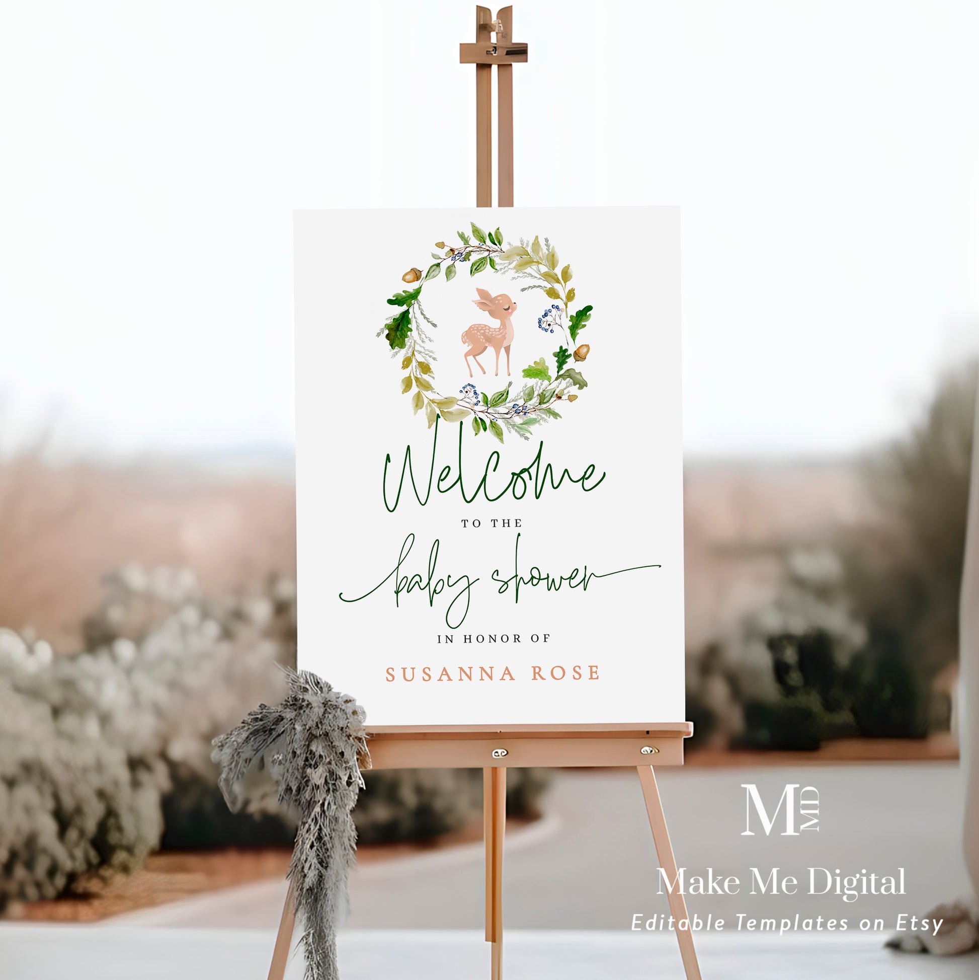 Woodland Deer Baby Shower Welcome Sign, Rustic Forest Baby Shower sign, Printable greenery Shower poster sign, Green baby sprinkle Editable